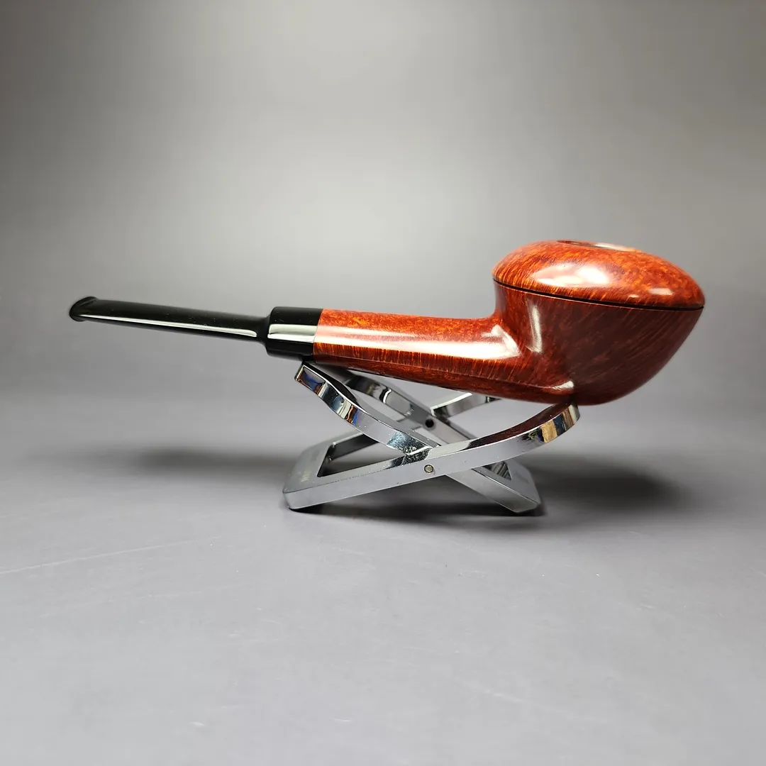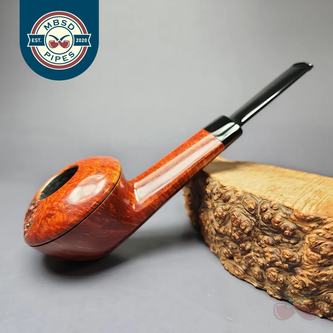 Wide shank bulldogs are by no means a new phenomenon, with “Eskimo” and “Inuit” variations being popularized by figures such as Ed Burak and Tom Eltang decades ago, and are indeed a staple shape of east European pipe making especially. This faceted rendition from Sebastian Heck, however, might be said to have more in common with a Poul Ilsted than any of the above, albeit with a distinctly squat twist. Long and low-slung, Heck’s bulldog nonetheless carries with it a palpable sense of speed, in part due to the way in which its grain appears to “leap” at a forward angle, and in part due to the slight tapering of the shank as it moves toward the pipe’s saddle mouthpiece.