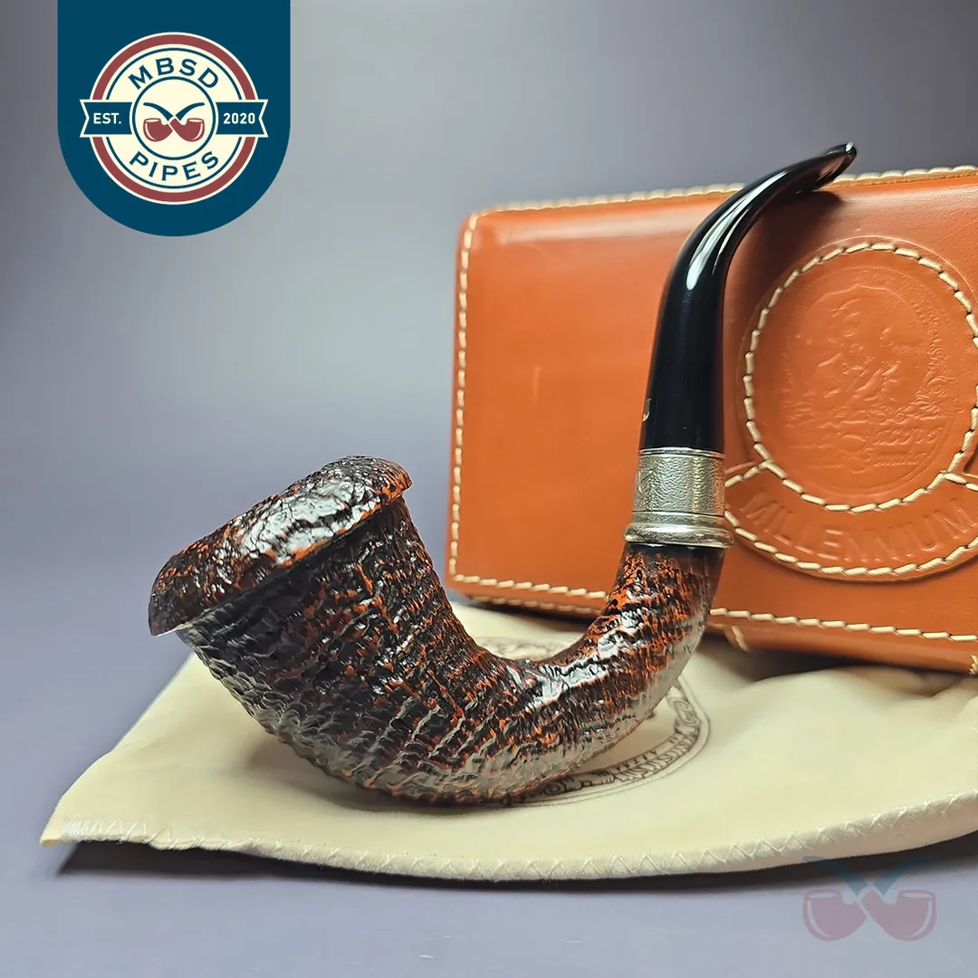 The year 2000 was marked by a number of esteemed pipe makers with a special, limited edition pipe. Ser Jacopo was one of these pipe makers, treating customers to not one, but two pipes to celebrate the turn of the new century. There was the 2000 Domina, Ser Jacopo’s “pipe of the year” equivalent that began in 1996, but there was also the The Millennium Pipe, seen here. The 2000 Domina was certainly a beautiful pipe, taking the form of a bent egg sitter with a sterling silver mount, but the Millennium incorporated something that has become closely associated with Ser Jacopo pipes and their more extravagant designs: curved drilling. Using specialized tools and techniques, Ser Jacopo’s Millennium pipe was about as faithful as one can get to the classical gourd calabash in terms of shaping, as an ordinary drilling technique is simply not capable of boring a draft hole at such an angle (the gourd calabash, being hollow and capped with a removable bowl, does not have this issue). Thus, as with the Domina series, The Millennium Pipe was a truly special piece, something only furthered by their shared, carefully engraved silverware. I mentioned in a previous listing that it is difficult to find a comparable pipe maker that truly throws out all the stops when it comes to celebratory, limited edition releases. The closest that comes to mind would be Dunhill, who, released both the Longitude and the Millennium Hallmark series back-to-back to celebrate the arrival of the new century. The difference, on the other hand, is that even the Dunhill Longitude was limited to 2000 pipes produced in total, whereas Ser Jacopo made only 333 of their Millennium Pipe.