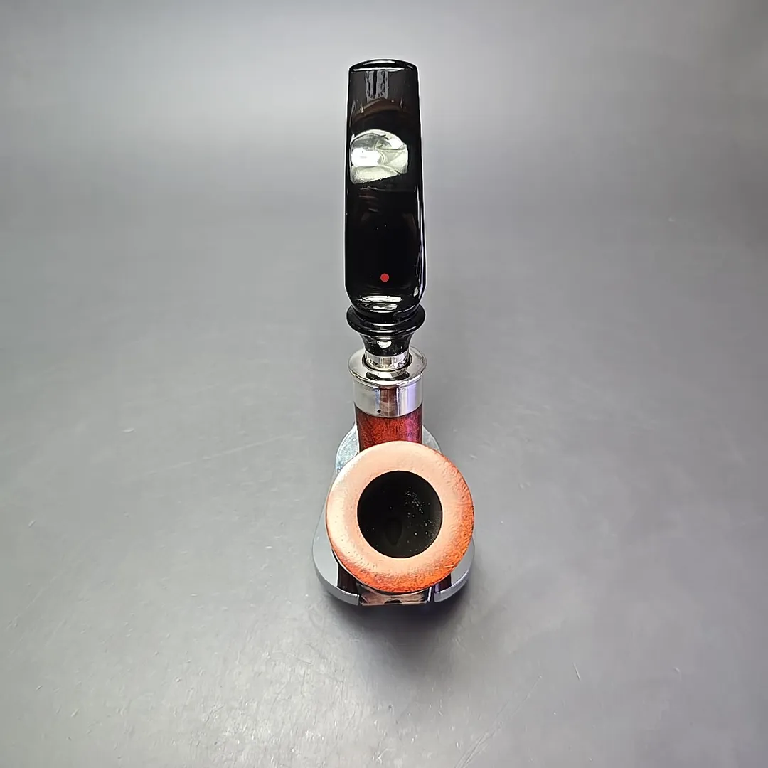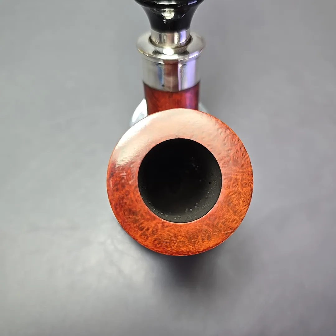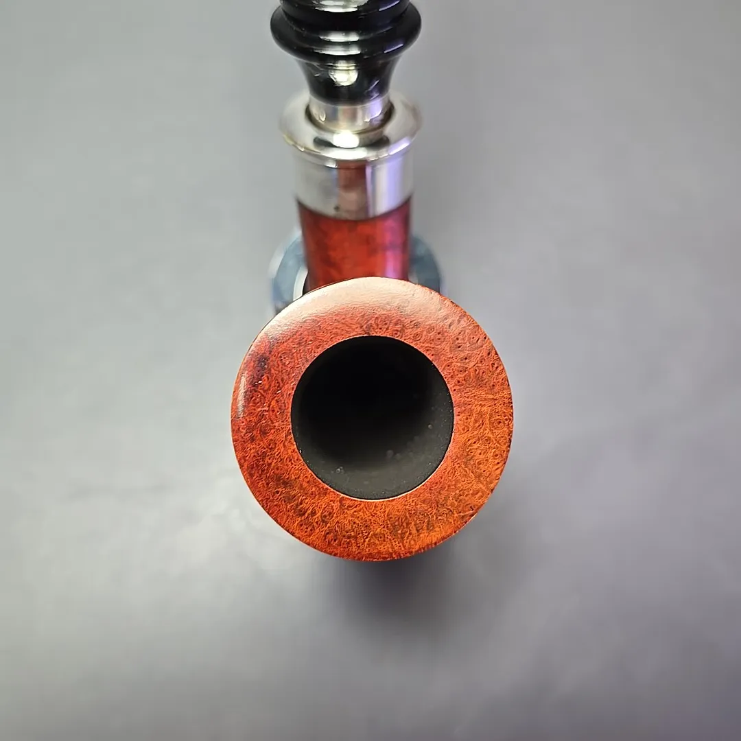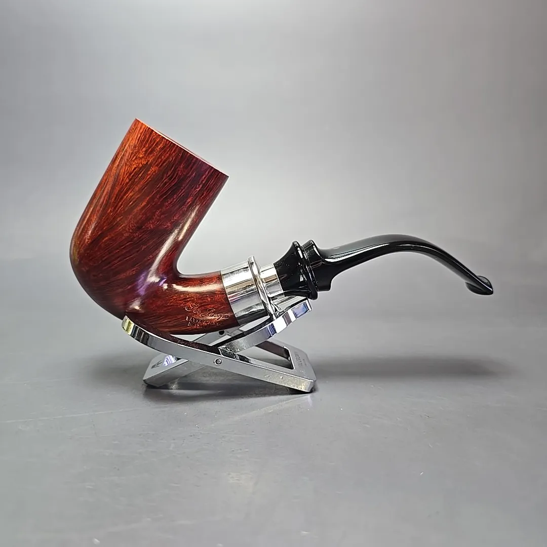 The lingua franca of the Renaissance was Latin and, as a workshop profoundly influenced by that period in European history, it is also the language adopted by Ser Jacopo when it comes to nomenclature. The Delecta, taken from a Latin term roughly equating to “delight,” is one of the names used by Ser Jacopo to designate a specific type of mount on the workshop’s pipes, often in the form of a rather ornate, sterling silver faux spigot. The name is apt, as it is indeed a very delightful addition, especially to more opulent designs like this stacked, champagne glass-like full bent billiard. Interestingly this pipe appears to be a 1990s make, from back when Giancarlo Guidi was at the helm of the Ser Jacopo workshop. It has what looks to be the plexiglass Ser Jacopo stem inlay, rather than the silver “J” used after 1997, the former being used today on sub-lines like the La Fuma, but which was, for a time, used for all Ser Jacopo pipes besides the Gem series. As I’ve detailed before in other listings, Ser Jacopo went through a number of stem logos before settling on the silver “J” used today, from gold-mounted gemstones to sea coral, though each had to be done away with due to circumstances outside of the workshop’s control. Thankfully the superlative quality of the pipes, however, remained much the same throughout.