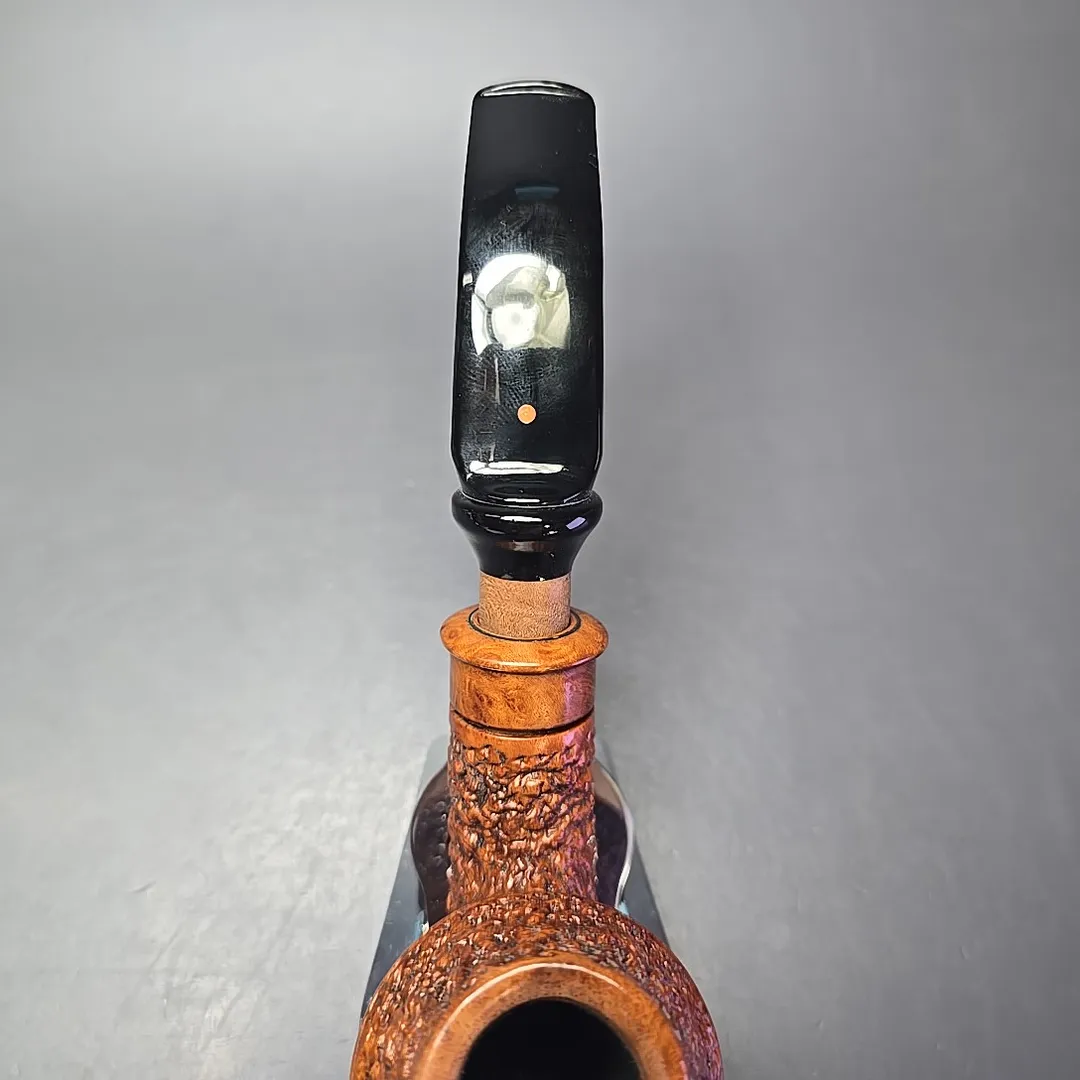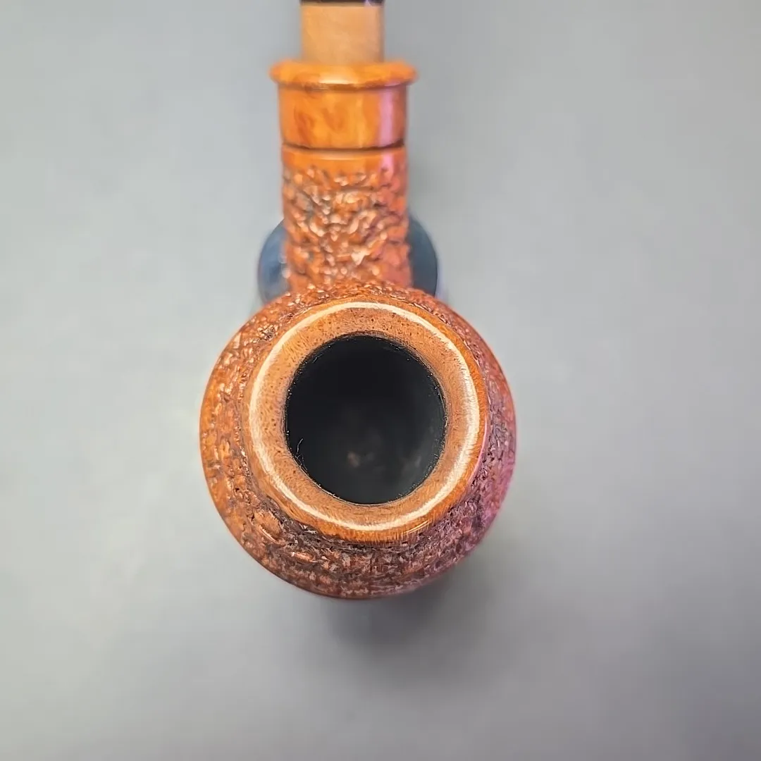 I say “early” as this particular Ser Jacopo comes from before 1994, during the first 10 or so years that the workshop was in operation, and during which time Giancarlo Guidi was firmly at the helm. As I’ve mentioned in previous listings, Ser Jacopo pipes went through a number of different stem logos over the decades, beginning as a gold-mounted gemstone (now used solely for ultra-high-grades), then a silver-mounted red sea coral dot (soon abandoned due to trademark disputes), then an un-mounted red sea coral dot, then a red plexiglass dot (now used solely for more affordable sub-brands like La Fuma and Modica), and finally the silver “J” on Ser Jacopo pipes today. This one features a coral dot which, as also previously estimated, was discontinued and swapped for the silver “J” around 1994, as EU conservation legislation was introduced around that time to protect endangered coral species (or, possibly, as early as 1989, when similar legislation was introduced in Sardinia, where red sea coral was predominantly harvested).