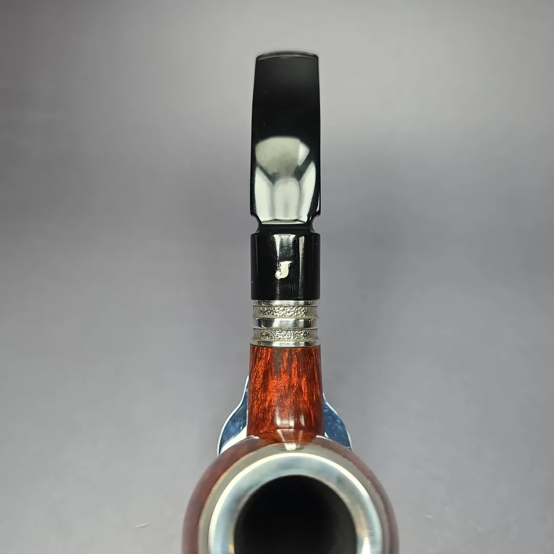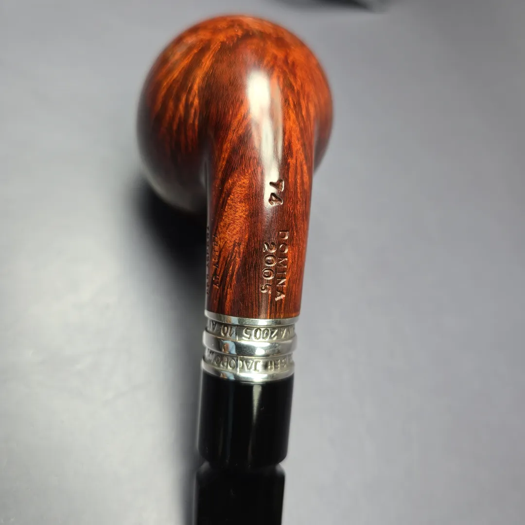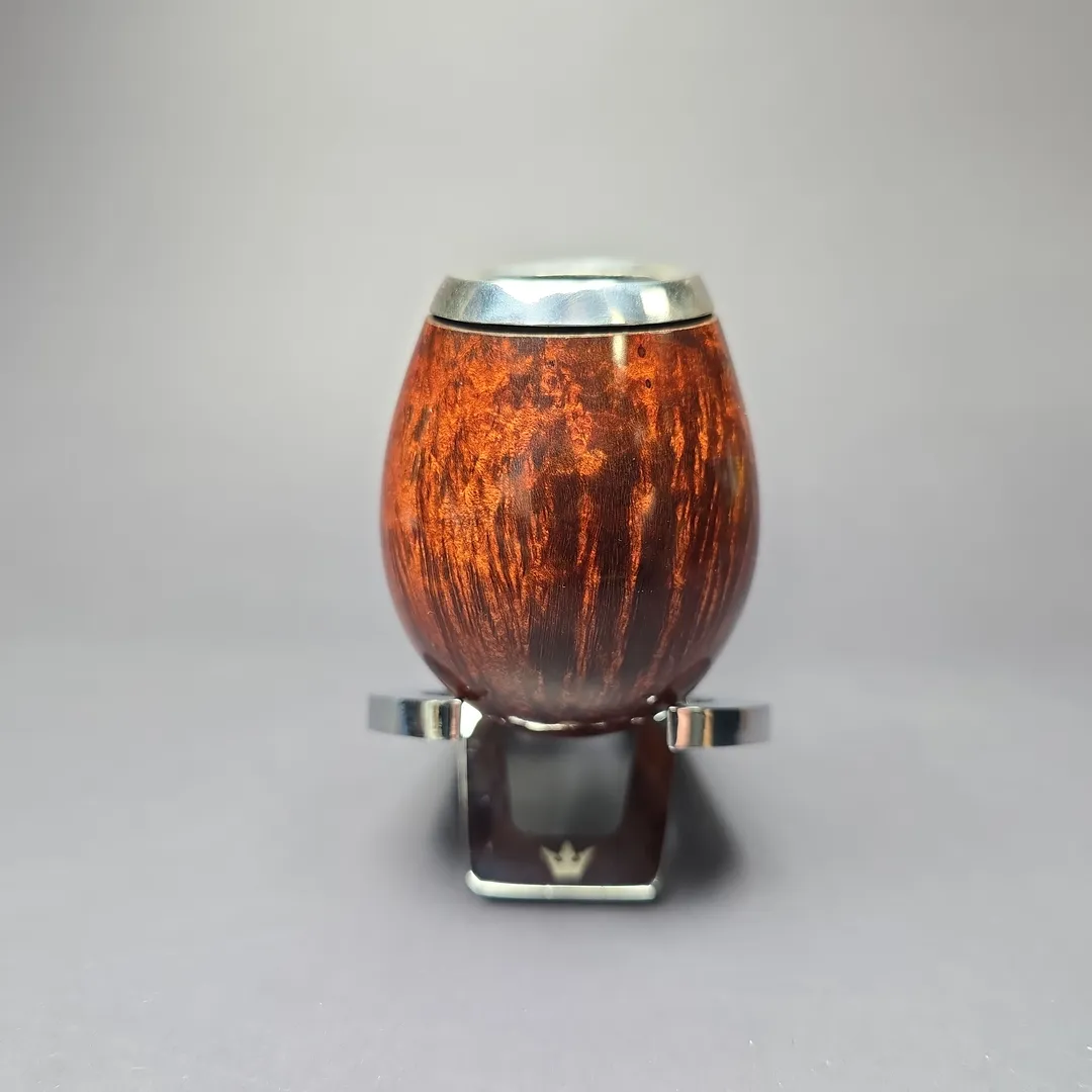 Ser Jacopo’s Domina series essentially functions as the workshop’s “pipe of the year,” proceeding via an annual release of special, one-off designs that began in 1996. While other esteemed makes have produced similar, annual offerings since at least the 1960s, Ser Jacopo’s version of this practice tends to result in pipes that throw out all the stops in terms of finish and finery, and which are much more limited in production compared to most of their peers. Ser Jacopo is closer to Dunhill than, say, Savinelli in that regard, with the total annual production of Domina pipes limited to just a few hundred pieces. This particular Domina is the 2005 iteration and the 10th of its kind since 1996. In virtue of this, the design of the pipe was even more spectacular than other Domina releases, taking the form of a voluptuous bent egg with a sterling silver cap and ornate, engraved collar. There’s certainly some Danish influence in the shaping, though with everything else taken into account, one might say that this egg is equal parts Former and Fabergé.