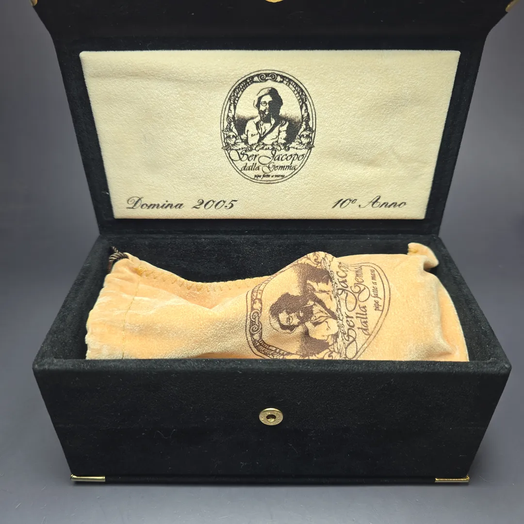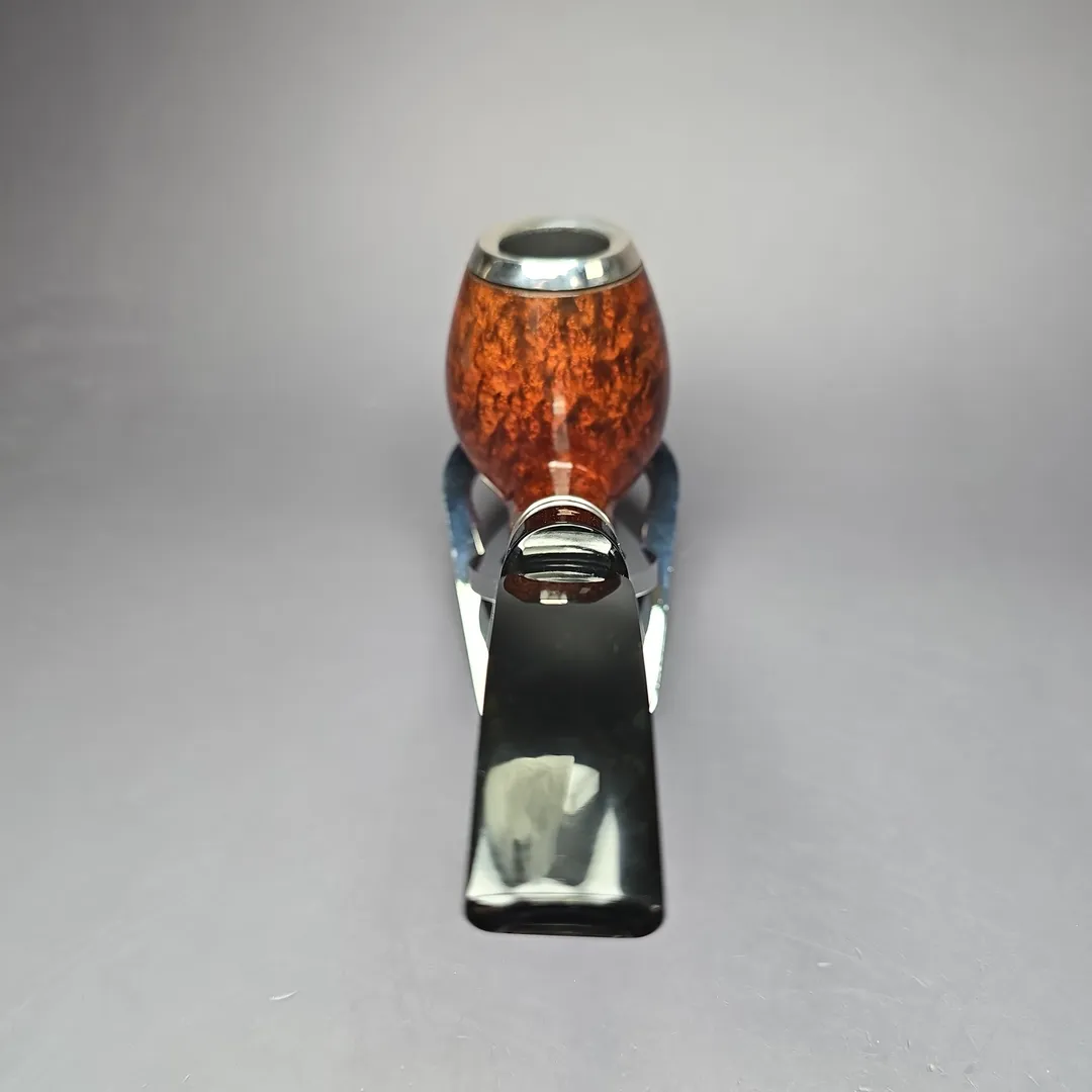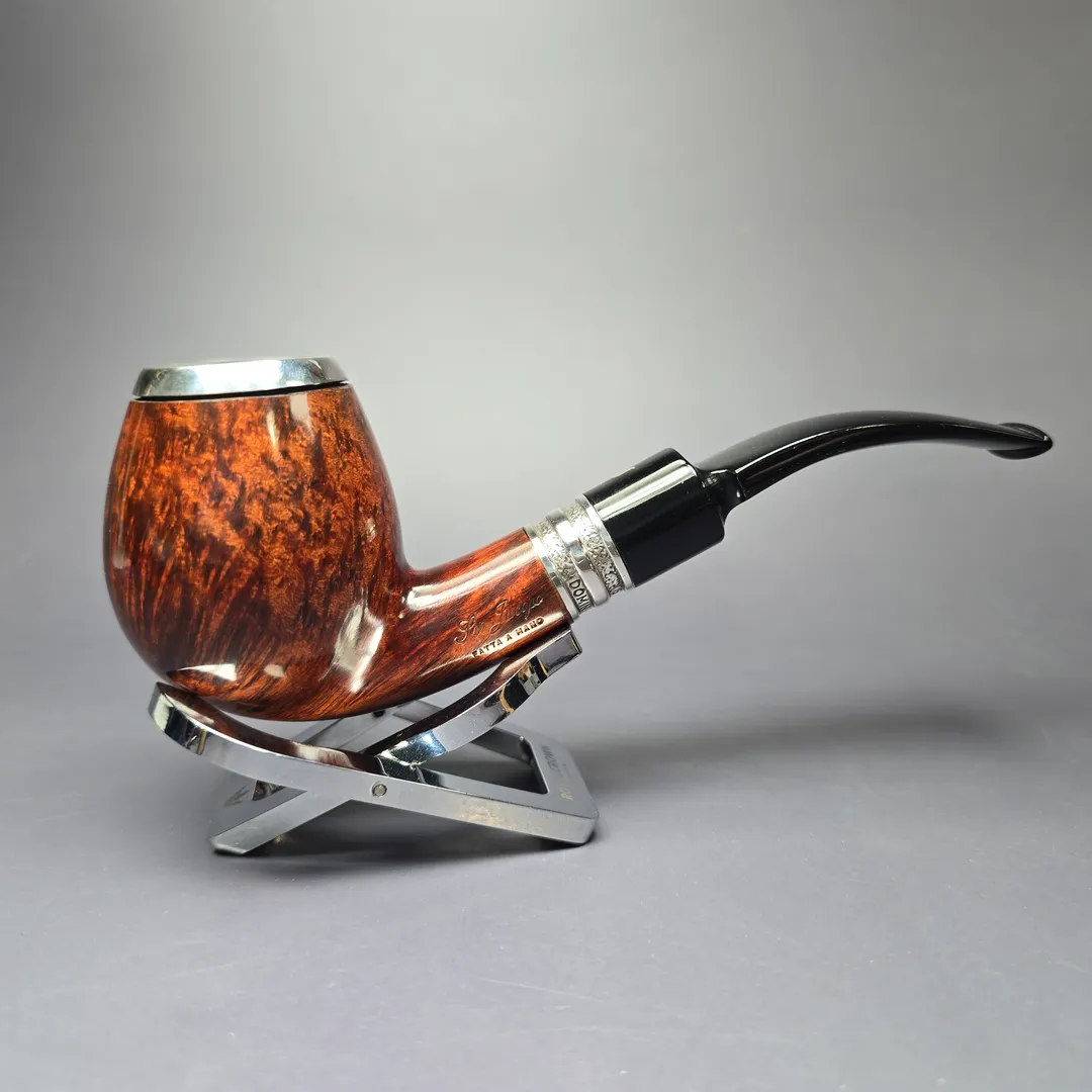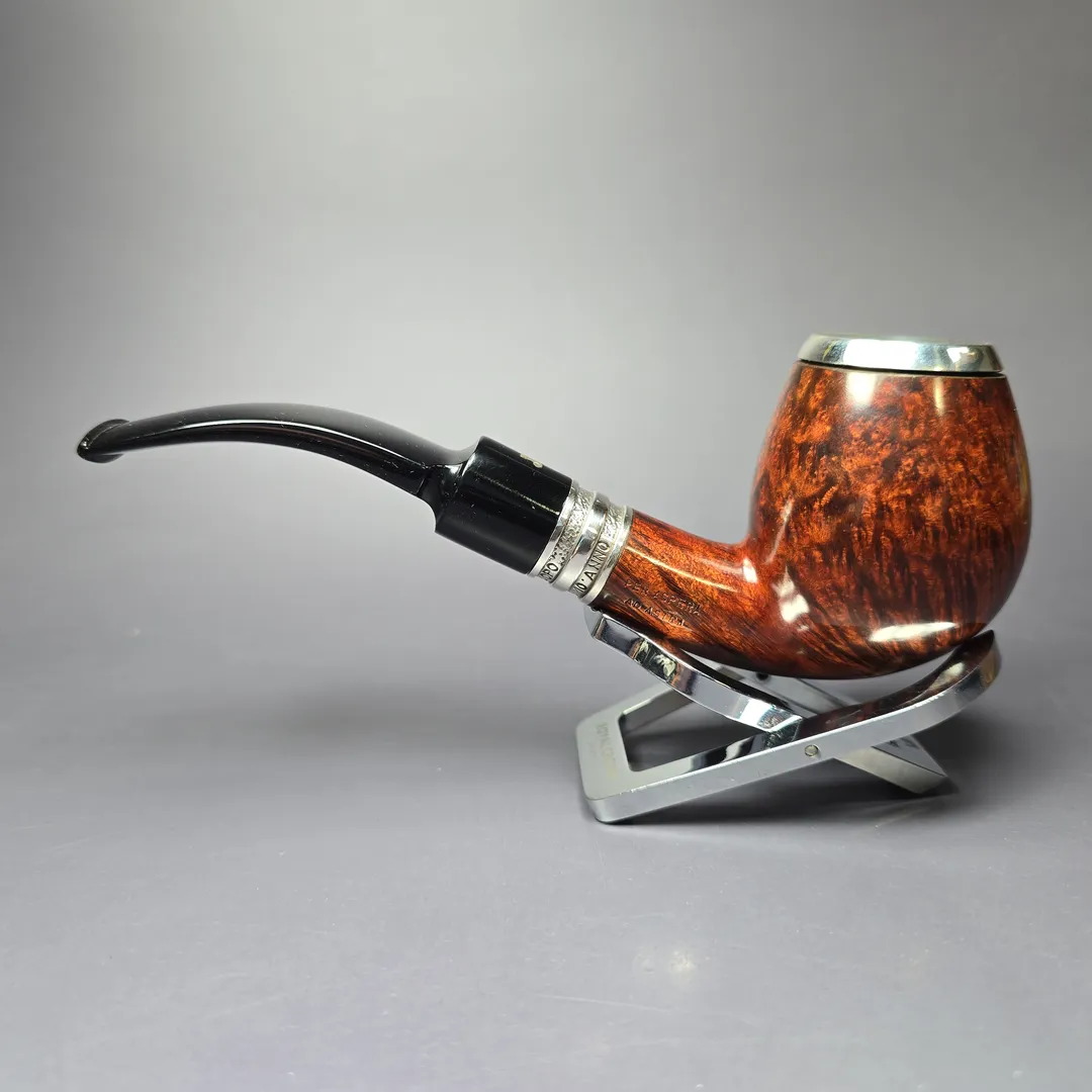 Ser Jacopo’s Domina series essentially functions as the workshop’s “pipe of the year,” proceeding via an annual release of special, one-off designs that began in 1996. While other esteemed makes have produced similar, annual offerings since at least the 1960s, Ser Jacopo’s version of this practice tends to result in pipes that throw out all the stops in terms of finish and finery, and which are much more limited in production compared to most of their peers. Ser Jacopo is closer to Dunhill than, say, Savinelli in that regard, with the total annual production of Domina pipes limited to just a few hundred pieces. This particular Domina is the 2005 iteration and the 10th of its kind since 1996. In virtue of this, the design of the pipe was even more spectacular than other Domina releases, taking the form of a voluptuous bent egg with a sterling silver cap and ornate, engraved collar. There’s certainly some Danish influence in the shaping, though with everything else taken into account, one might say that this egg is equal parts Former and Fabergé.