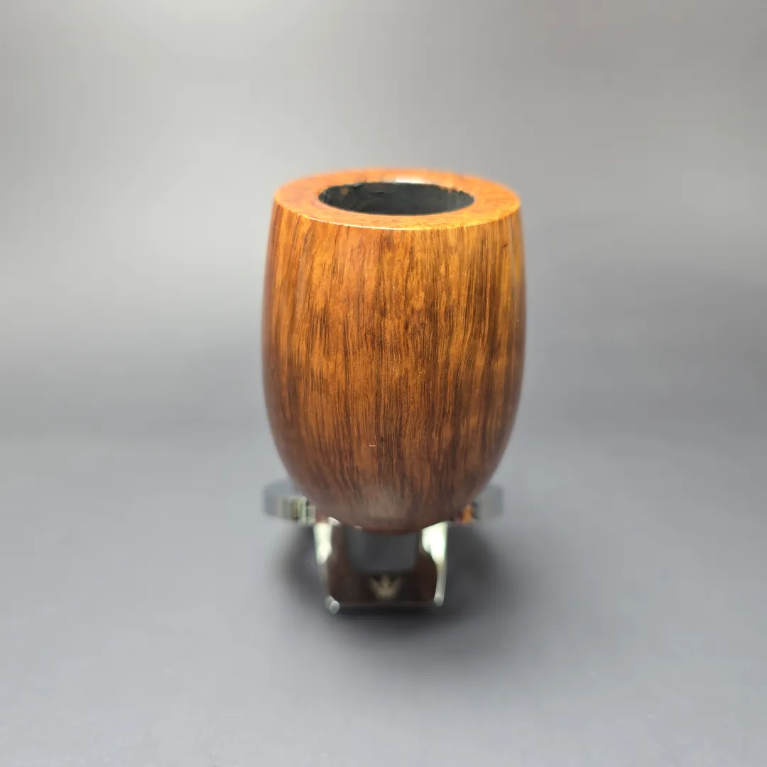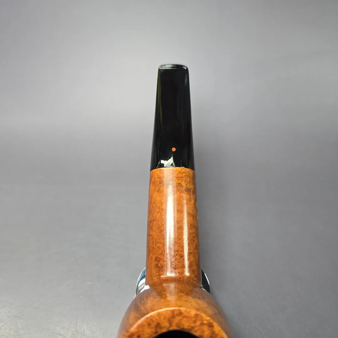 The key to dating this one is the stem logo. As I’ve mentioned in previous listings, Ser Jacopo pipes went through a number of different stem logos over the decades, beginning as a silver-mounted gemstone, then a silver-mounted red sea coral dot, then a similarly-hued, red plexiglass dot (now used solely for more affordable sub-brands like La Fuma and Modica), and finally the silver “J” on Ser Jacopo pipes today. This one features a coral dot which, as also previously estimated, was discontinued and swapped for the silver “J” around 1994, as EU conservation legislation was introduced around that time to protect endangered coral species (or, possibly, as early as 1989, when similar legislation was introduced in Sardinia, where red sea coral was predominantly harvested). This one looks to be the red plexiglass logo (though, given why it was chosen, it is a little difficult to tell), making it at least a pre-1997 piece. The design is indeed a very large, muscular billiard, with proportions almost like a beefed-up Dunhill LB rendition, and a superbly grained one at that.