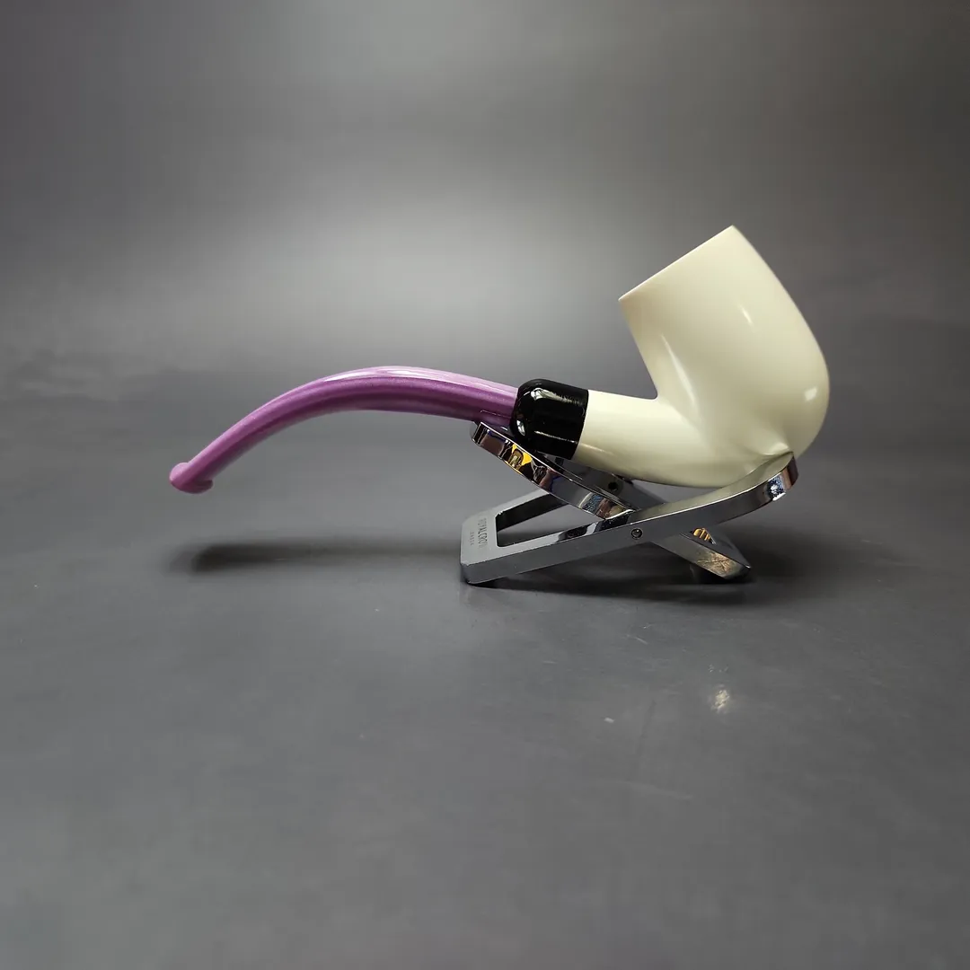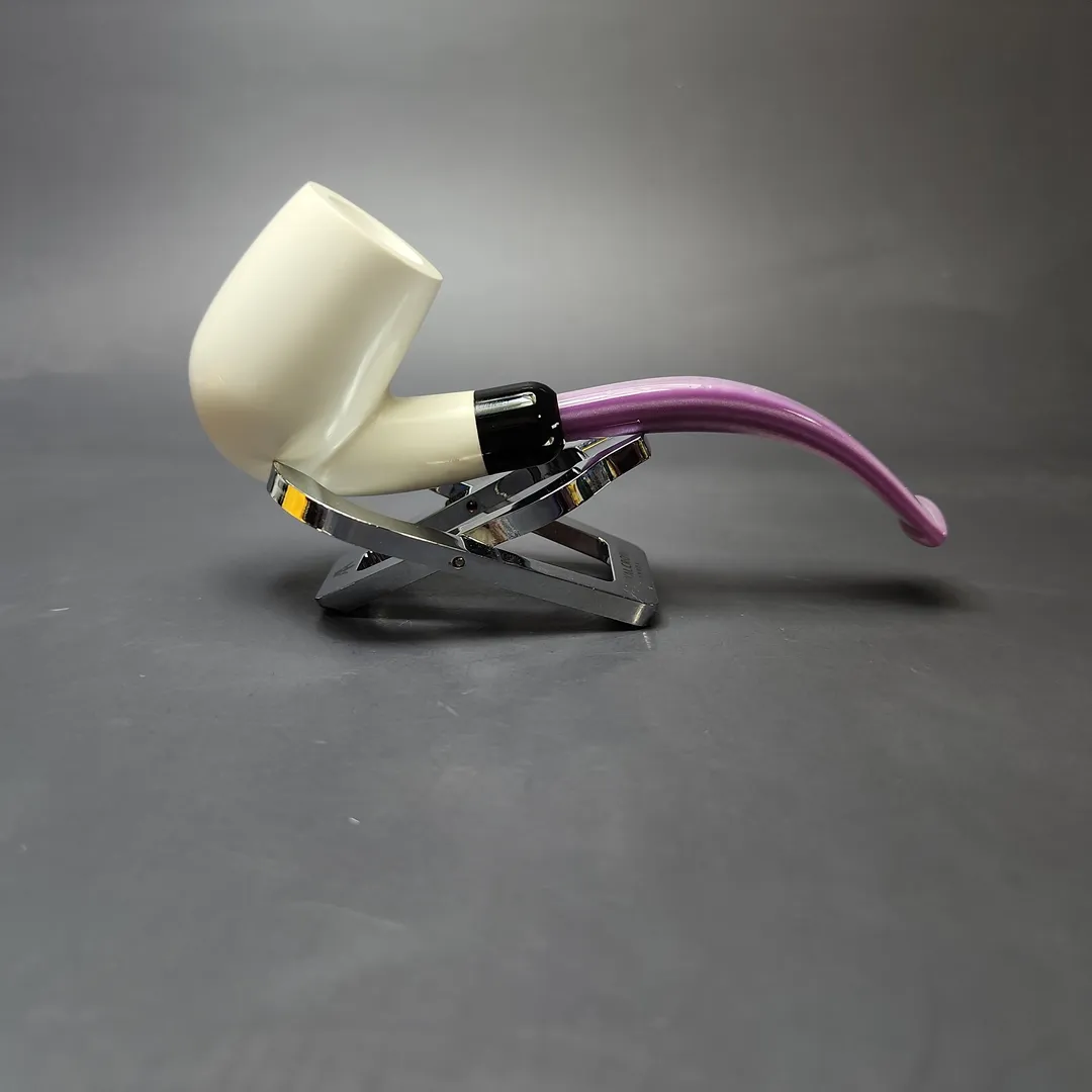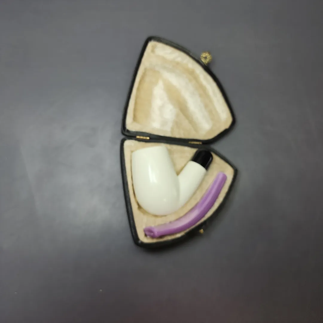 Smooth Bent Billiard w/ Purple Stem & Case Estate Block Meerschaum Pipe, Unsmoked