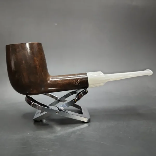 This particular pipe, from Ohio’s Stephen and Roswitha Anderson, is a very traditional, large billiard in the English mold. It does however deviate a little from tradition thanks to its ivory-hued lucite stem, which contrasts nicely with the bowl’s walnut stain.