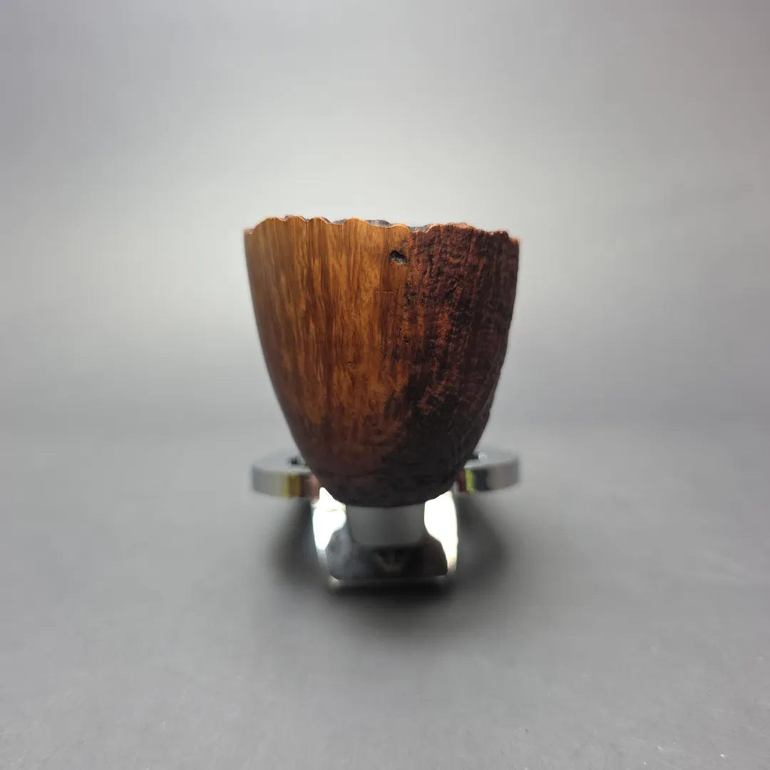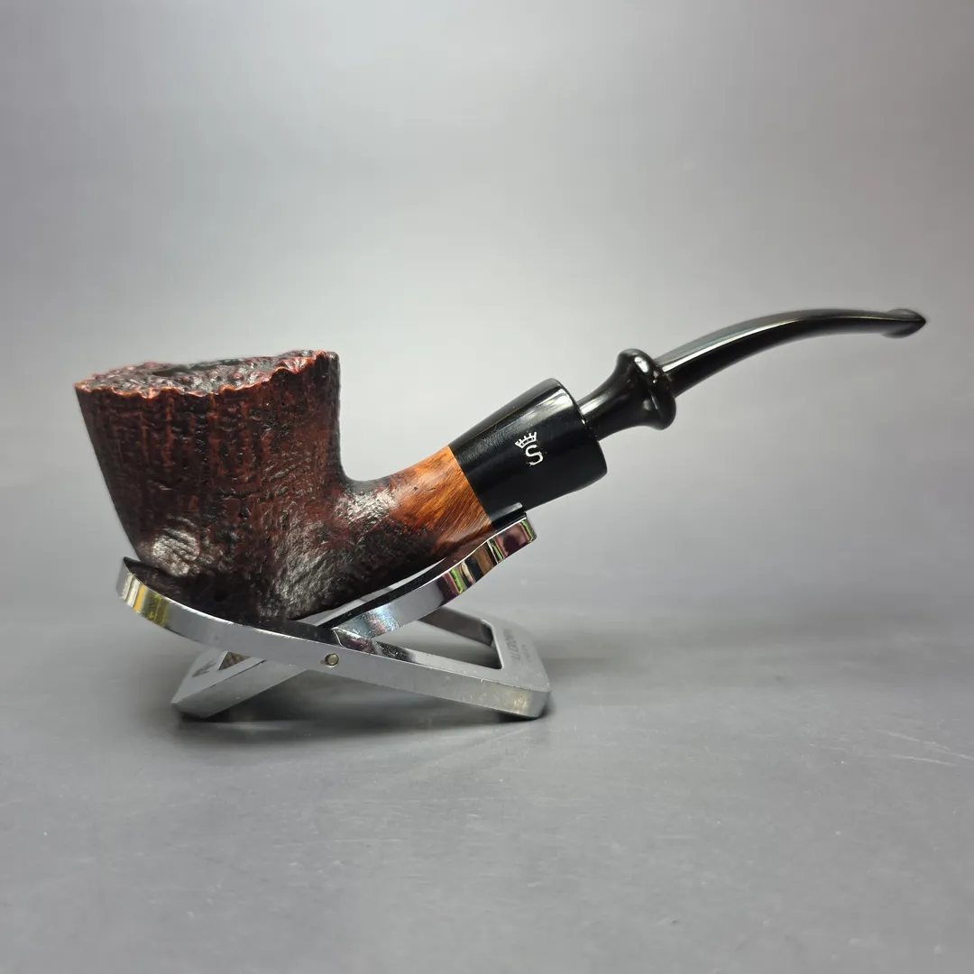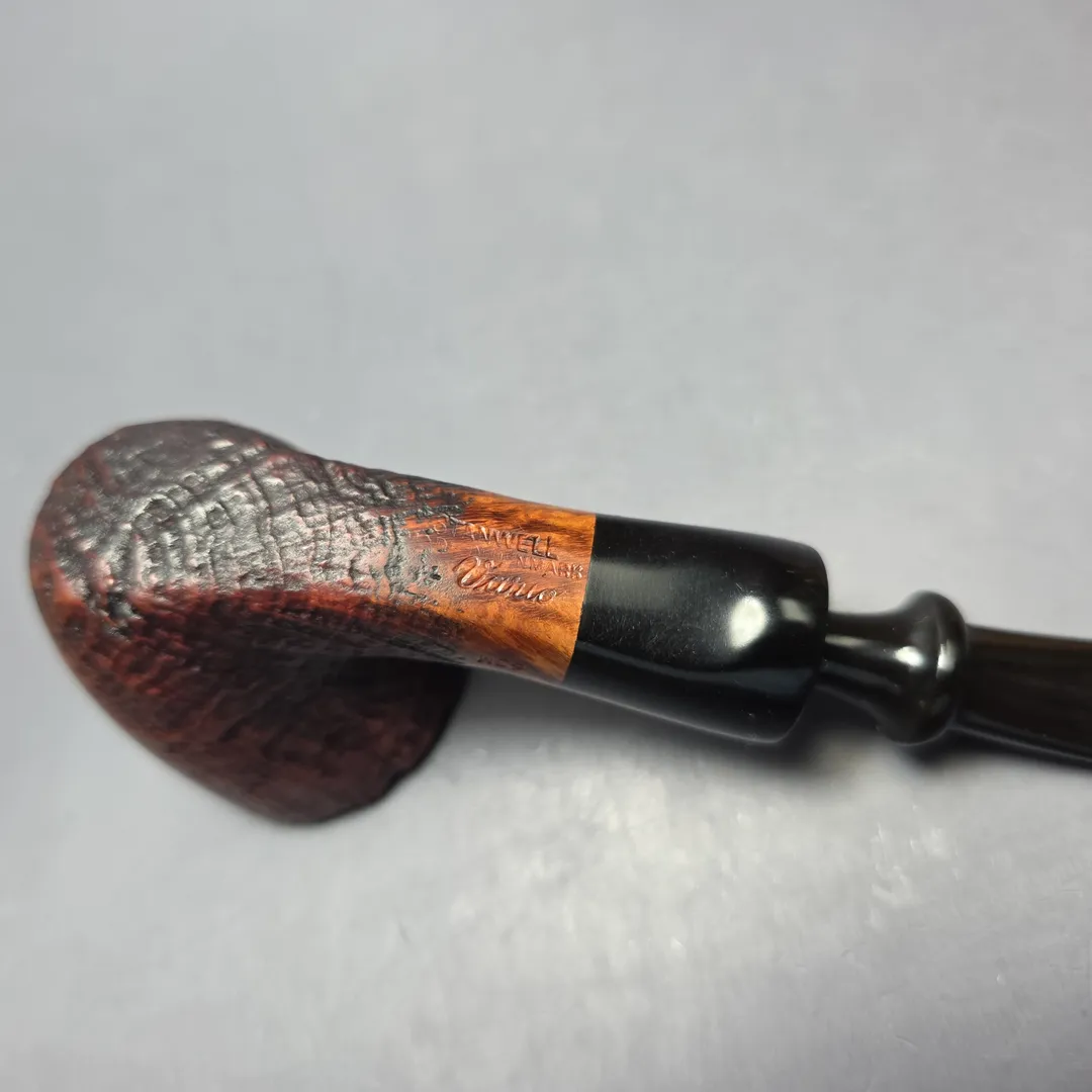 Stanwell’s Vario line first appeared around the 1980s, if memory serves, and was distinguished by a previously unexplored theme among Stanwell’s designs: mixed finishes. As gestured to by the name, Vario pipes were variously smooth polished and sandblasted, before being given a two-tone finish that was similarly divided between the different sections of the bowl. In the case of this one, the Vario finish has been applied to one of Stanwell’s most classic and enduring shapes, the “63” Dublin designed by Sixten Ivarsson in the 1970s. In fact, it’s the vulcanite army mount version of the “63,” designated the “63M,” as was standard for Stanwell’s “Military” mounted models at the time. The shape is a personal favorite of mine (yes, I have one), which in this instance has been given a real distinctive edge through its blending of ring grain and straight grain.