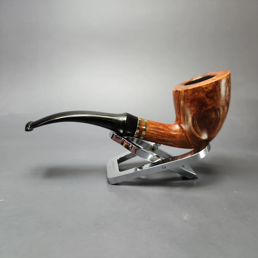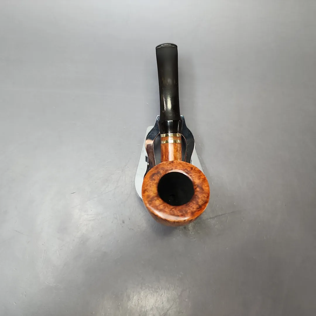 The “138” is one of the many shapes that appeared and, almost as suddenly, disappeared amidst a succession of significant changes in Stanwell’s design approach between the the mid-1980s and 1990s. This was a time when Stanwell was pivoting hard into the German market, discontinuing countless older catalog shapes, and enlisting more and more of Denmark’s master artisans to design and/or make pipes for them, including Jess Chonowitsch, Per & Ulf of S. Bang, Poul Winslow, Karl Erik, and, of course, Tom Eltang, to whom the 138 is attributed. As for the design, it’s an interesting one, in part because there were, seemingly, two slightly different iterations of the 138, with the key difference being the cut of the stem. In either iteration, the bowl was a very Danish hybrid of Dublin, horn, and pickaxe shapes, but while some 138s had a relatively traditional saddle stem, others—like this one—were slightly flared, giving the latter more of a “Danish” edge. Tangent aside, this long-discontinued shape come from the similarly discontinued Brass Band line, which featured a very classy red and gold motif, by way of an accent fashioned from two of its titular collars and one of cumberland ebonite.
