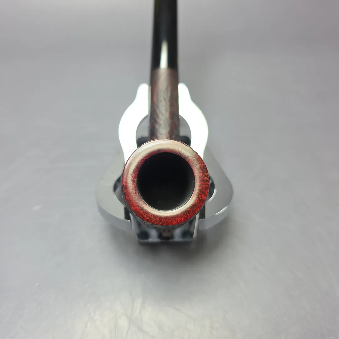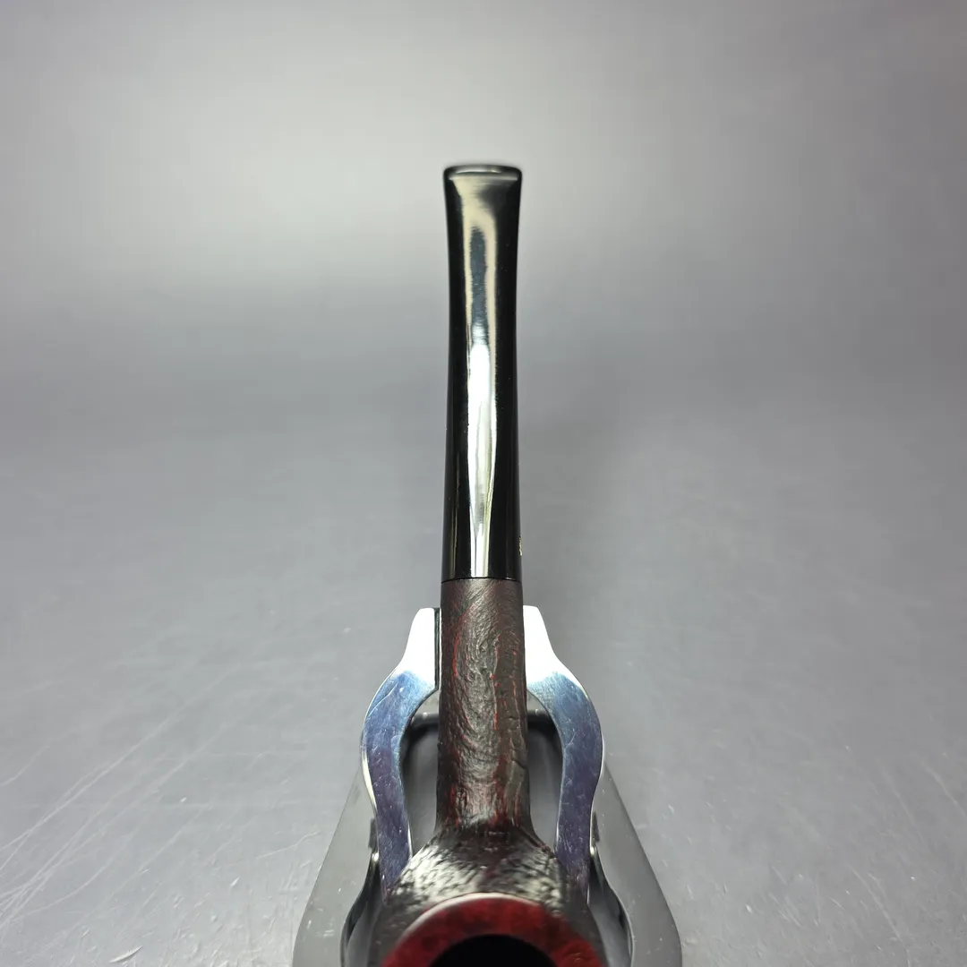 Stanwell’s Featherweight pipes are something of an oddity within the make’s history. They can be roughly divided into two groups: those which were made within the very first decades of Stanwell’s operation; and those which were made much more recently, in around the last two decades. Both have been termed “Featherweight,” or “Featherweights” by Stanwell, but they have been quite distinct from one another. The early Featherweights of the 1950s and 1960s were simply scaled down, or fortuitously lightweight renditions of other shapes in production at the time, with seemingly very little by way of regularity in production or proportions, and which were designated solely by their four-digit (rather than two or three) shape codes. The Featherweights of the 2000s onward, on the other hand, were both more rigid and more varied in approach. Many shapes in the new Featherweight line were created specially for it, and many were featured in it exclusively. These could be similar to existing designs, but their proportions were firmly established, especially the significant number of them designed for Stanwell by functionalist champion Tom Eltang. Some shapes, on the other hand, featured simultaneously in the Featherweight line and in other lines, with no change to the shape code used. The 107 was an example of the latter, being a slender, lightweight billiard rendition also found in several of Stanwell’s other lines, including the Bamboo and the 75th Anniversary. This one is a crisp, sandblasted rendition, with a modest burgundy stain and excellent, layered ring grain.