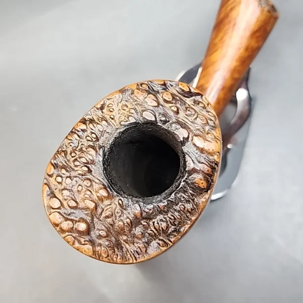Stanwell started producing what we call freehand pipes in the 1960s, and continued producing them intermittently until the early 2000s. This freehand is from Stanwell’s Registration Era (1948-1970), meaning it was made some time before 1970. During this period, Stanwell’s freehands were made by Poul Hansen, a master pipe maker who had apprenticed under Sixten Ivarsson before joining Stanwell’s production team. Hansen’s skill shines very clearly through this one. Carved with a noticeable intention to preserve the briar’s natural straight grain, this Prestige is a paragon of the Danish freehand movement. It’s a very large pipe, but one that has still managed to find the perfect combination of form (including a bare plateau rim) and function, sitting very well in the hand despite its size.