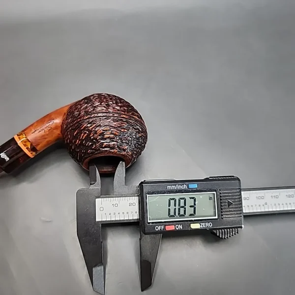 Stefano Santambrogio’s pipes are more playful than most other Italian workshop makes. Like Denmark’s Peder Jeppesen, Santambrogio’s pipes are typically colorful, incorporating mixed finishes and accents in designs that are unique both in relation to other Italian pipes and in relation to other pipes from his own workshop. This one is no different; it is curiously squat and round bent Rhodesian, so much so that it could instead be categorized as a bent ball with bead-lines. The bowl is dressed in a vermicular rustication, while the shank is left smooth, rising toward an amber-hued accent and stem.