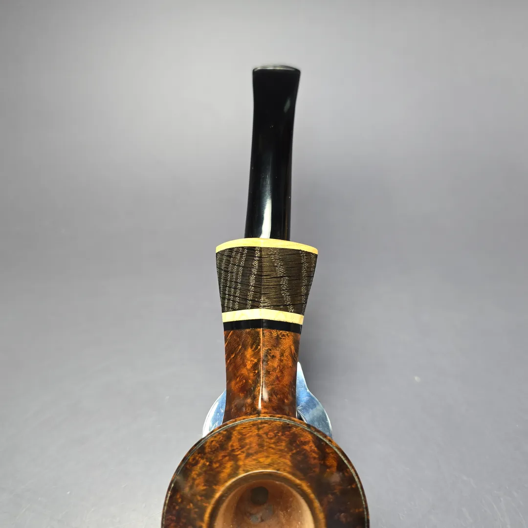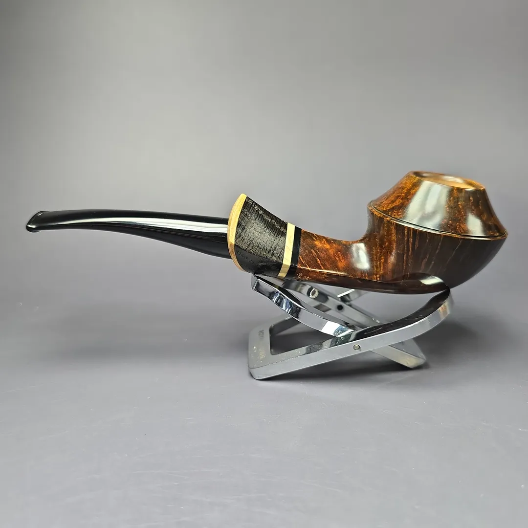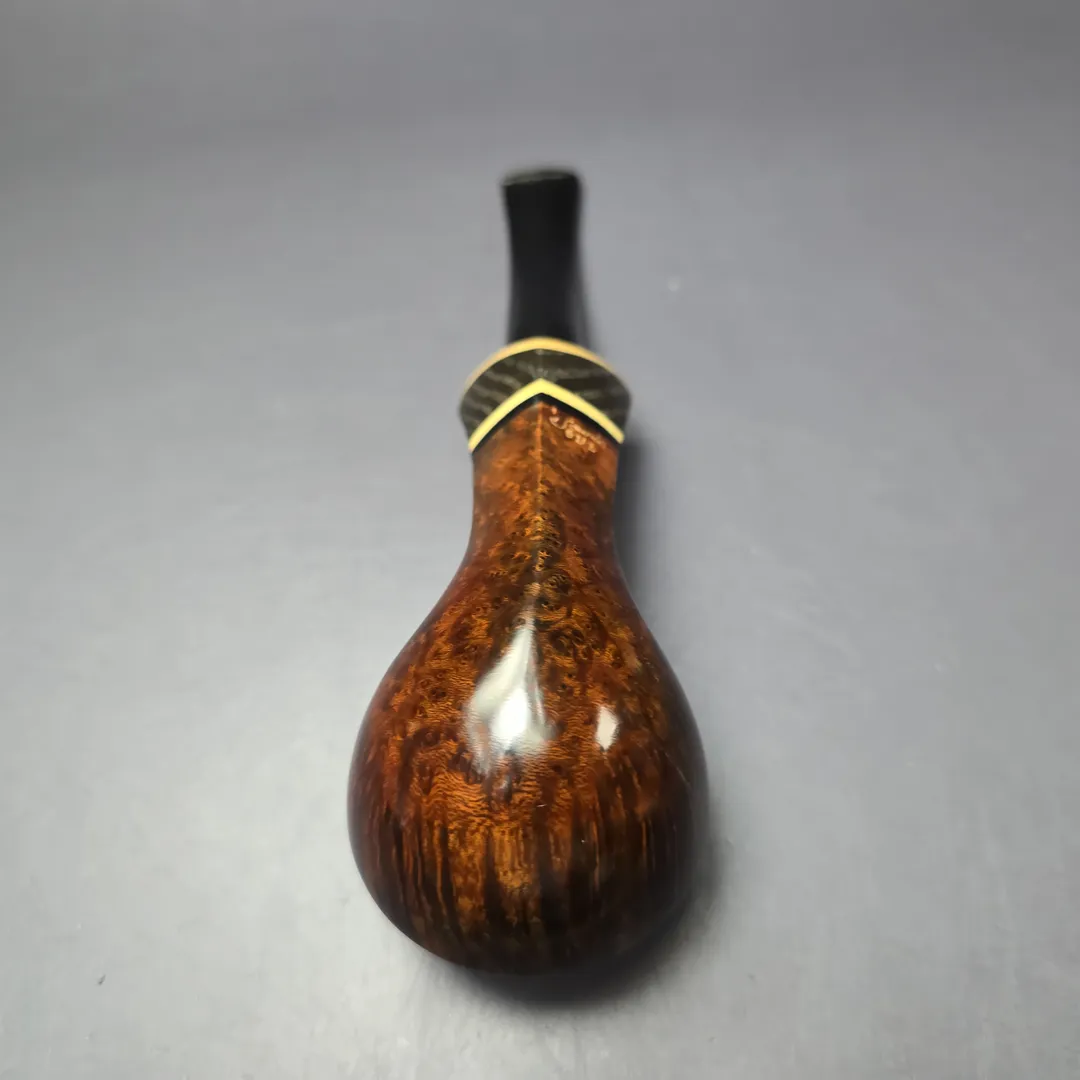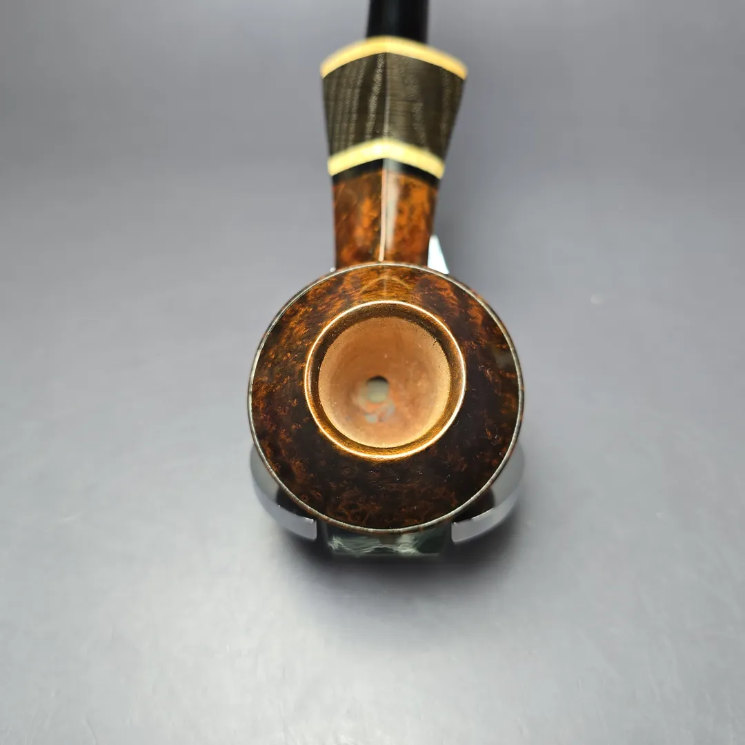 The bulldog, for example, is one shape that Downie has periodically returned to throughout his career, but his approach to form and ornamentation always makes for a highly unique rendition. There are various Downie signatures at play in this one, from the bowl’s sloping cap, to its mobile, “flight”-like posture, to the layered, “ebony and ivory” accenting of the shank end (in this instance, by way of a ferrule cut from privet and morta, if my eyes don’t deceive me). It all makes for a beautiful pipe just beyond the margins of convention, and indeed a very much recognizable Downie creation. Within Downie’s own grading scheme, which runs, in ascending order of quality, from 5 to 1, this pipe attained a rare grade 2.