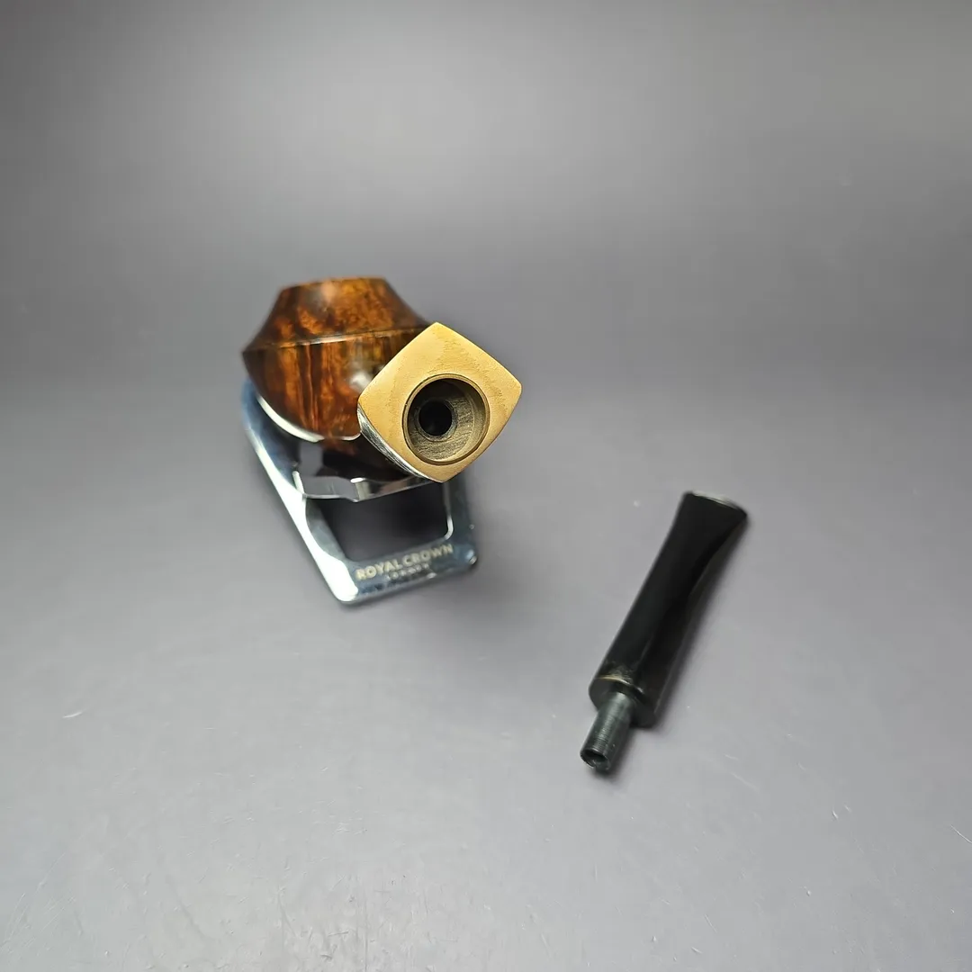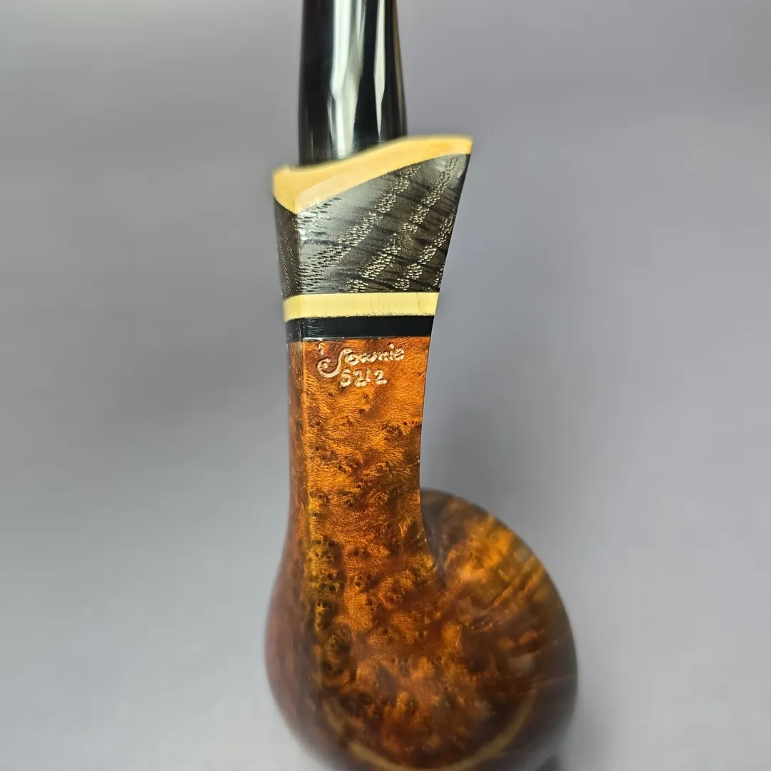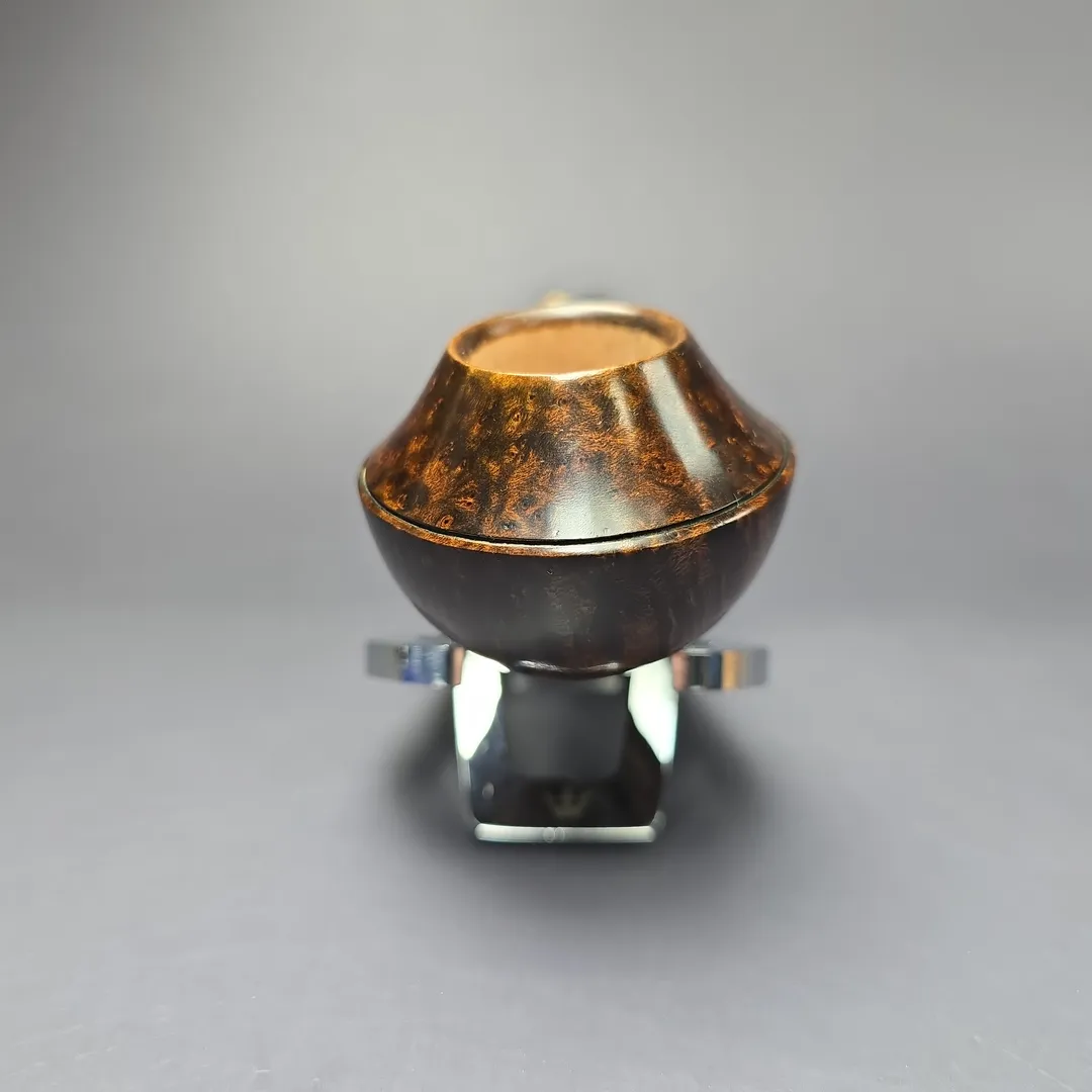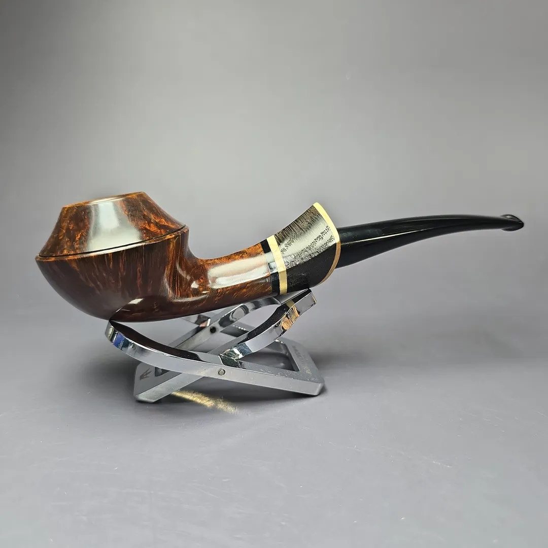 The bulldog, for example, is one shape that Downie has periodically returned to throughout his career, but his approach to form and ornamentation always makes for a highly unique rendition. There are various Downie signatures at play in this one, from the bowl’s sloping cap, to its mobile, “flight”-like posture, to the layered, “ebony and ivory” accenting of the shank end (in this instance, by way of a ferrule cut from privet and morta, if my eyes don’t deceive me). It all makes for a beautiful pipe just beyond the margins of convention, and indeed a very much recognizable Downie creation. Within Downie’s own grading scheme, which runs, in ascending order of quality, from 5 to 1, this pipe attained a rare grade 2.