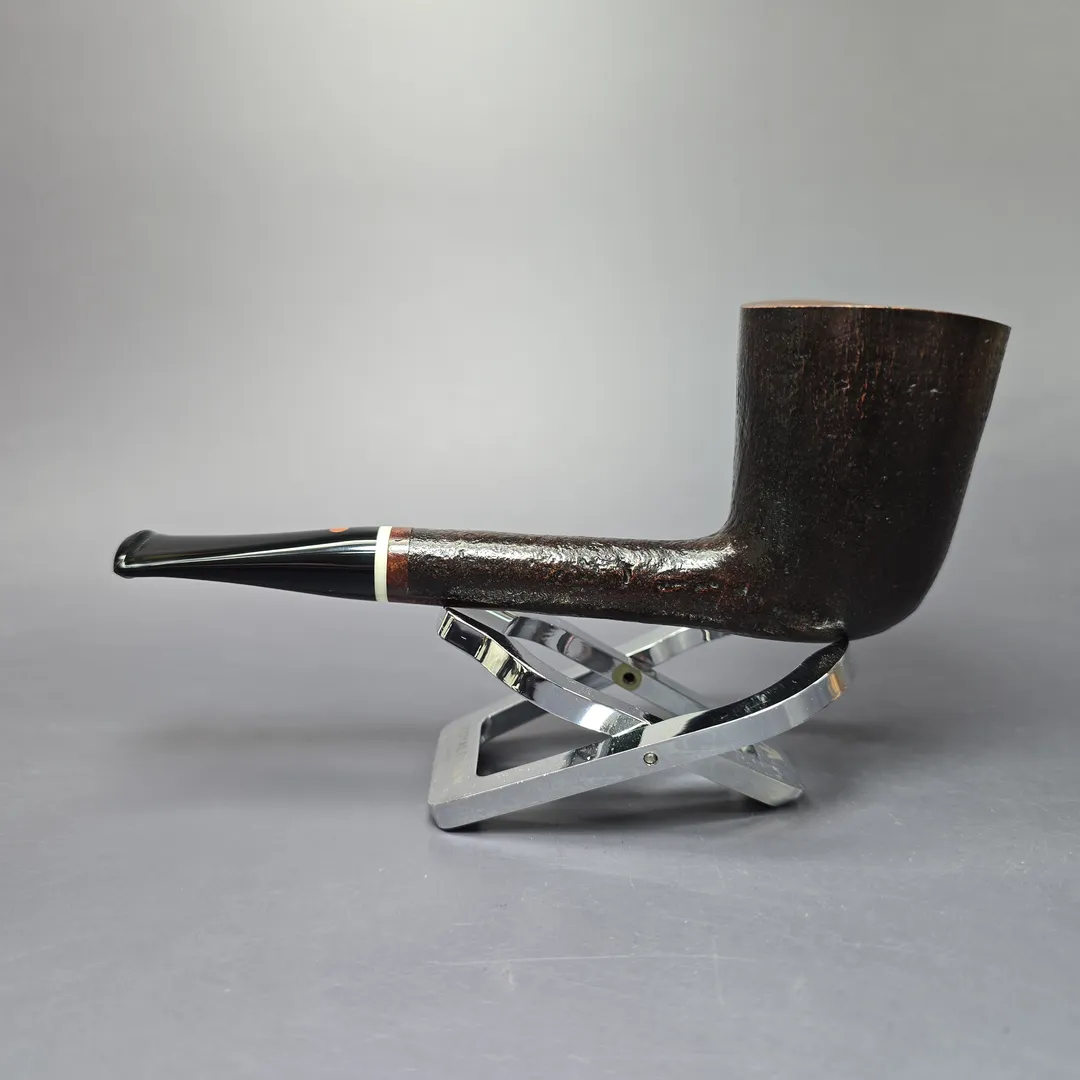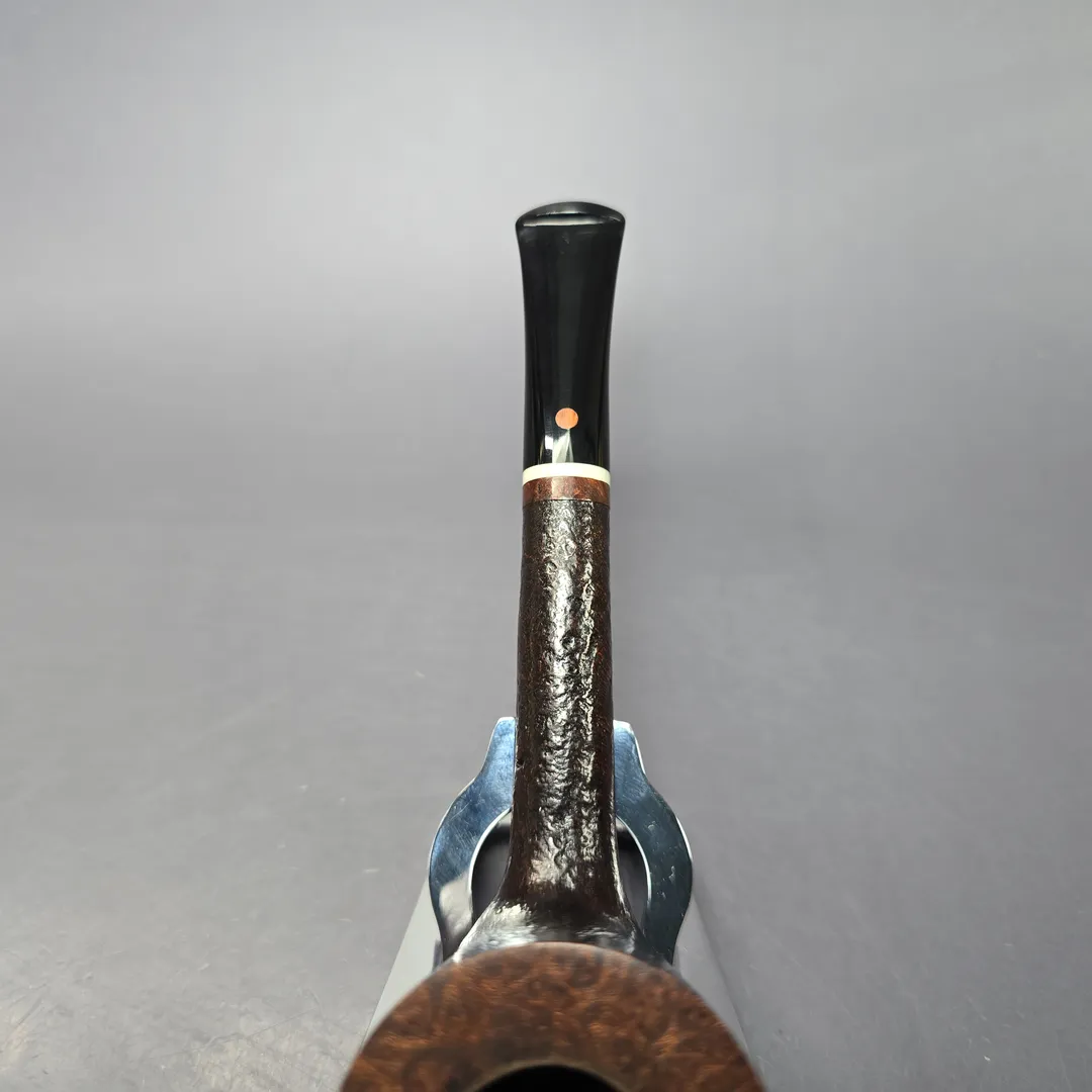 Scandinavian pipe historian Jacob Groth talks about how, in post-war Denmark, there were entire “schools” of pipe makers whose styles and techniques could be connected to a central “teacher” figure. There were those pipe makers who had studied under Sixten Ivarsson, for example, and those who had studied under Poul Rasmussen; a few years down the line, there were, similarly, pipe makers who had worked under Former at WO Larsen, and others who had worked for Preben Holm. Though artisan pipe making has become much more international, and design philosophies have cross-pollenated far more than they used to be able to, one could still make the case that a similar phenomenon occurs in American pipe making, even toward (and, indeed, after) the end of the 20th century. One might speak of a “Todd Johnson school,” for example, especially given how prolific he’s been as a mentor to contemporary American artisans. Though he didn’t have quite as many students, another reasonable example would be Mike Butera. If one looks at the pipes of, say, Michael Frey, Larry Roush, and Premal Chheda, there are varying degrees of Butera’s influence that can be felt in their pipes. Steve Weiner is another pipe maker whose work strongly evokes his mentor, Butera, and he and Frey were likely the closest in style. This pipe from Weiner’s last years has much of the heft, height, and hybridity in form found in Butera’s work, as well as the more subdued approach to sandblast finishing seen in the latter’s Vintage series. That’s not to say it’s derivative, of course, rather that there’s a certain pedigree and family resemblance to it, with the quality of its construction following suit. One could go further, in fact, and argue that a line can be drawn from a pipe like this one, through Butera, right the way to Castello’s Great Line pipes. Does this one belong to a Carlo Scotti School or a Mike Butera school? A difficult question. Is it an excellent pipe? Much easier: yes.