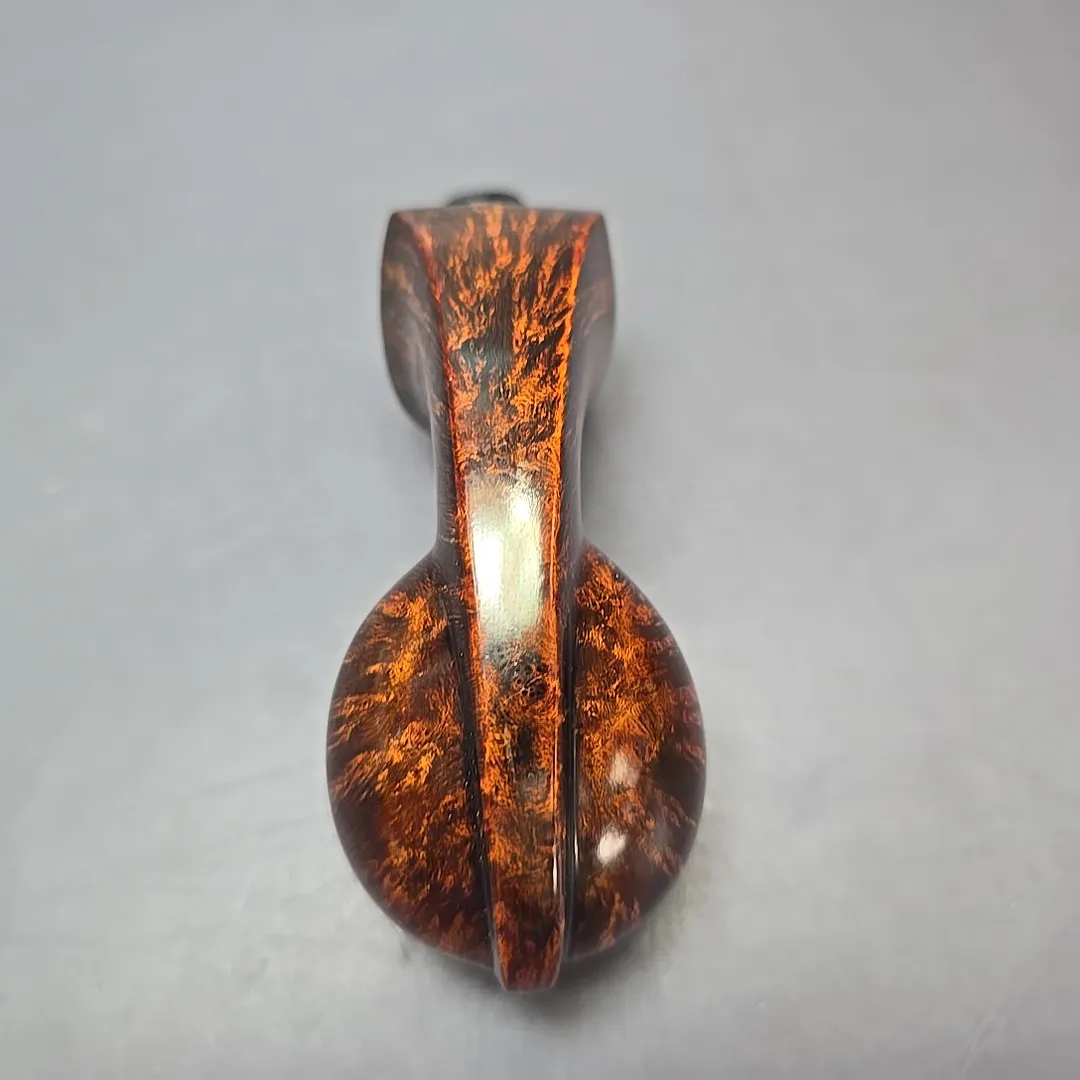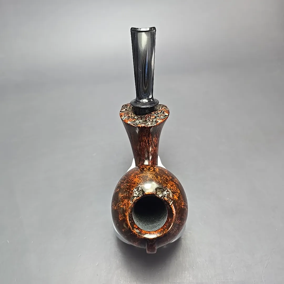 For this pipe, for example, Urgan turned to one of the great dynasties of Scandinavian pipe making for inspiration, one that has had a considerable influence on his work, as is the case for many an artisan: the Ivarsson family. Like Lars Ivarsson and his daughter, Nanna Ivarsson, Urgan is a great fan of bulbous blowfish shapes, and in this instance the pipe serves as an homage to the wonderfully plump, “mushrooming” blowfish designs of Nanna. In true Scandinavian fashion, the pipe is dressed in a deep, golden contrast finish and is accented by a dash of live plateaux edge at both the rim and shank end of the bowl, though a slightly more unconventional touch has been added by way of a swirling blue, cumberland-style ebonite mouthpiece.