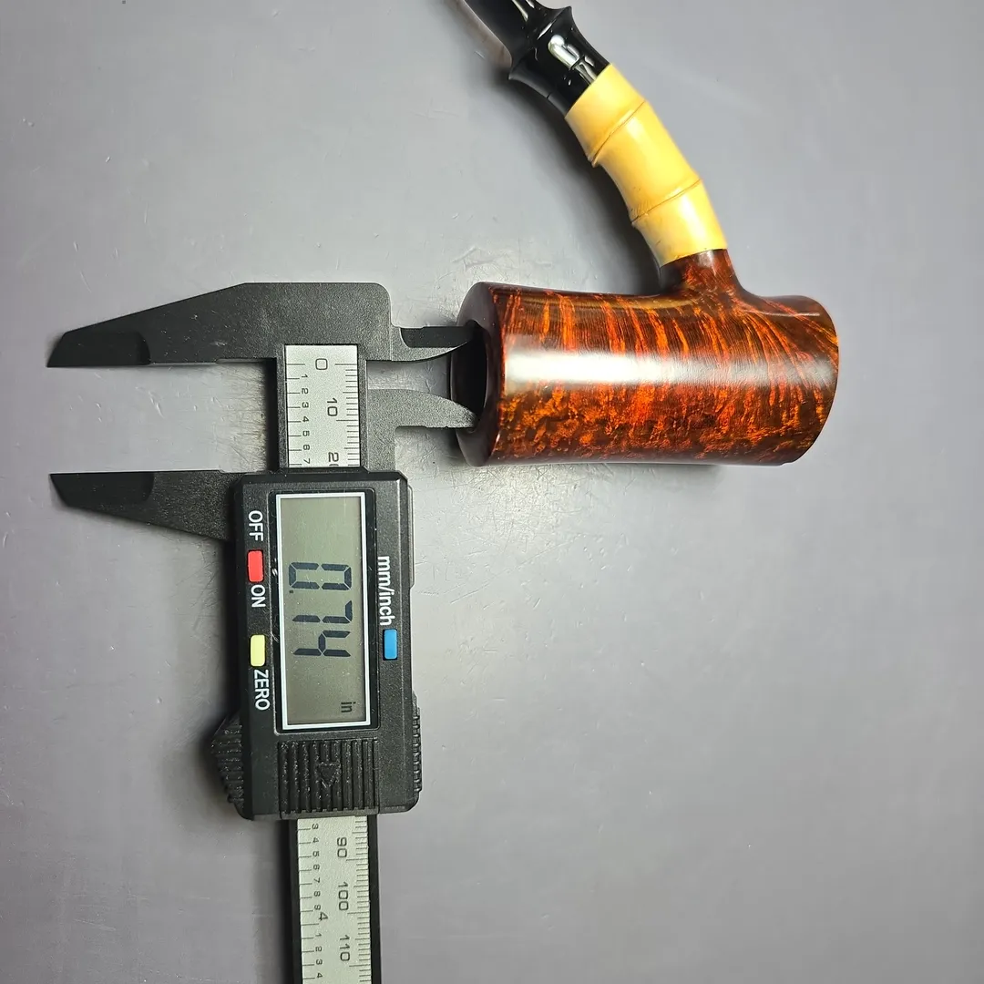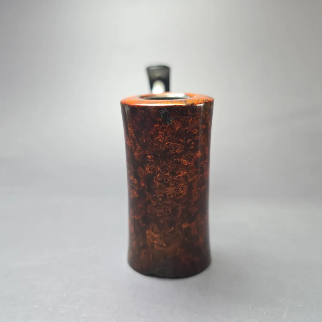 In the case of this pipe, one can see parallels between its elementary form and the poker and cherrywood revivals ushered in by Danish functionalists such as Tom Eltang. Rather than follow the path taken by Eltang and disciples such as Mike Bay, Urgan’s rendition is decidedly stout and sturdy, with a towering bowl lit up by cross-grain and bird’s-eye. Combined with the thicker species of bamboo used for the pipe’s shank extension, the overall design incorporates both the ergonomic simplicity of the Danish schools with the more muscular figure typically found in pipes carved from meerschaum.