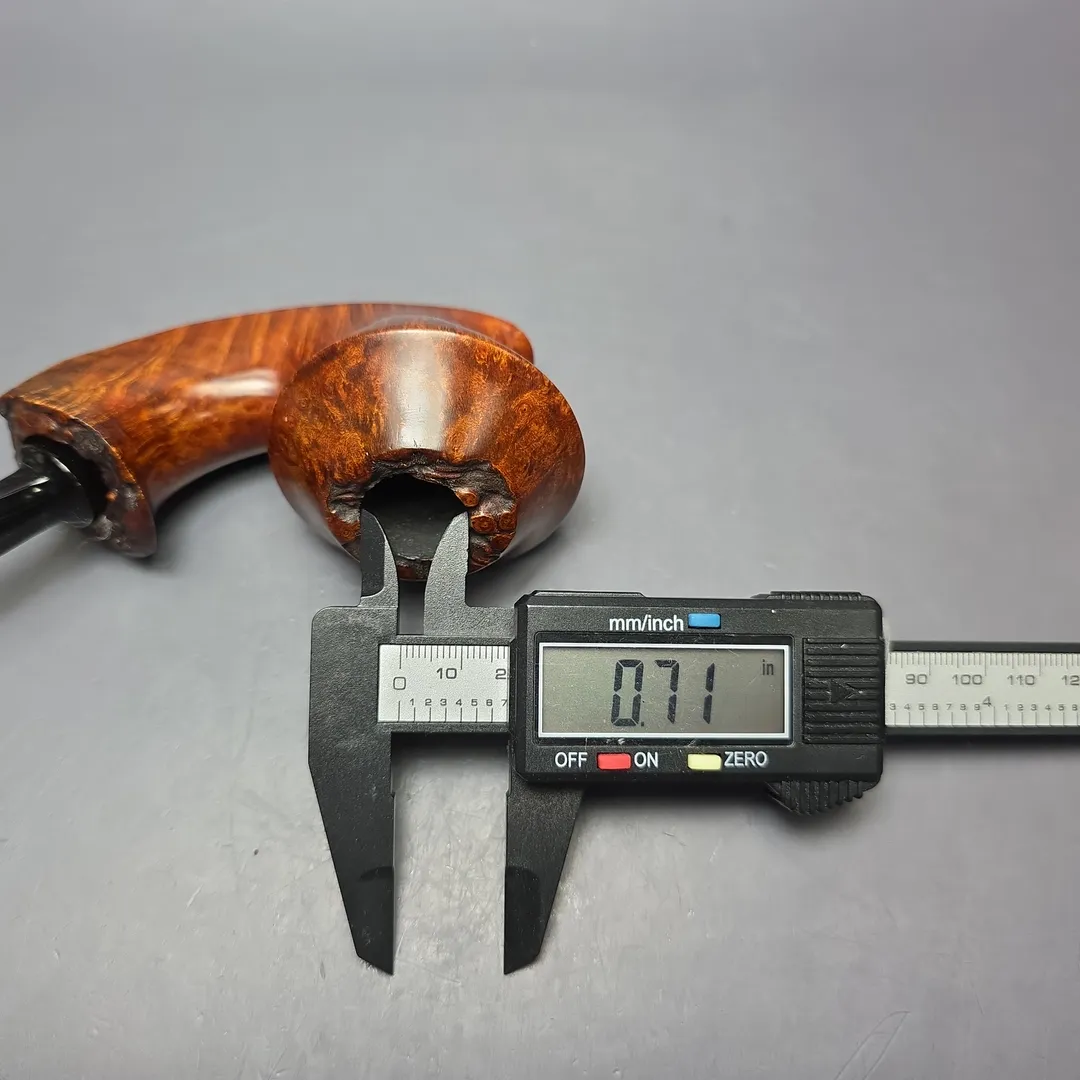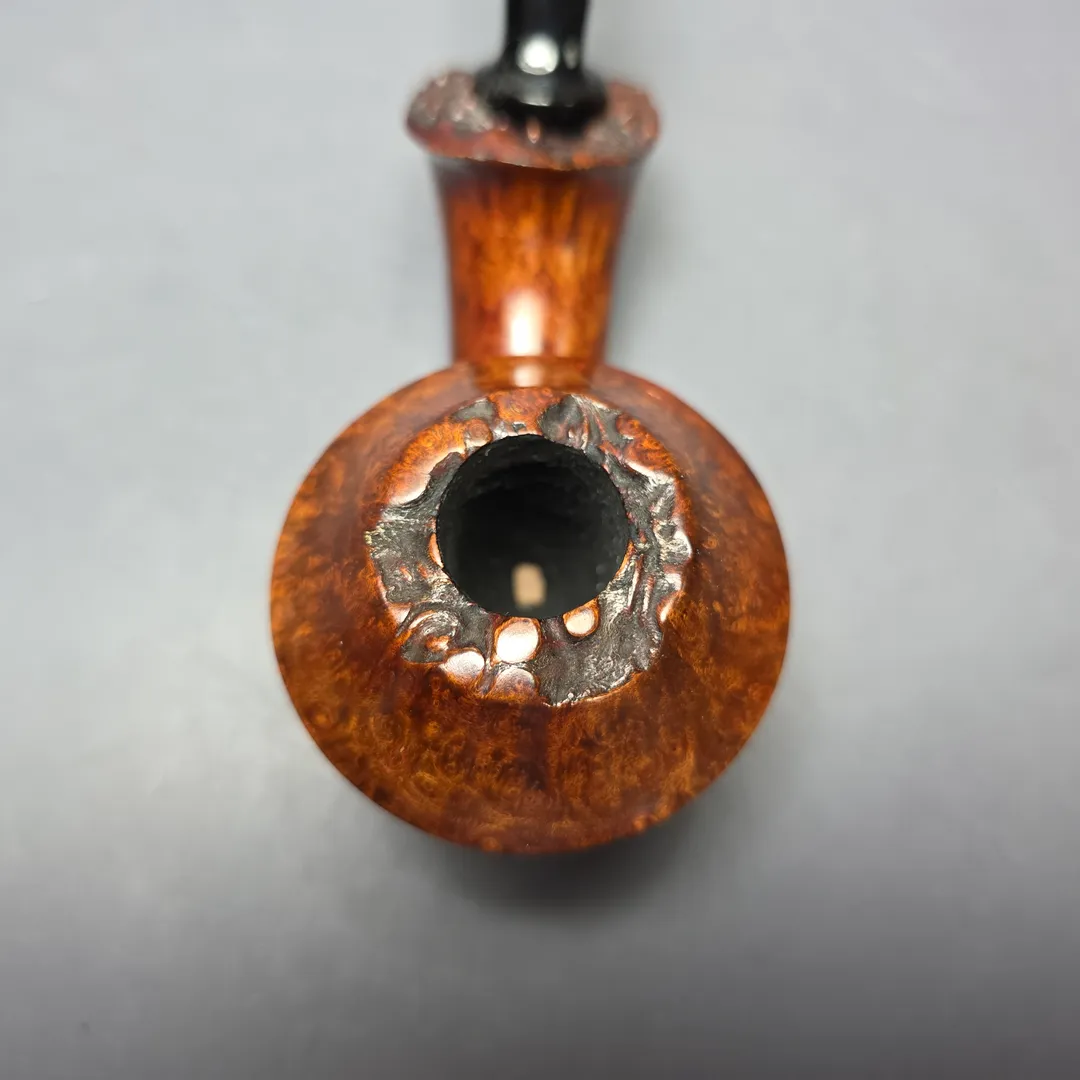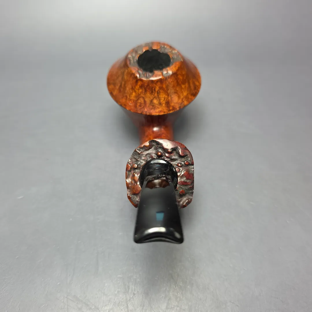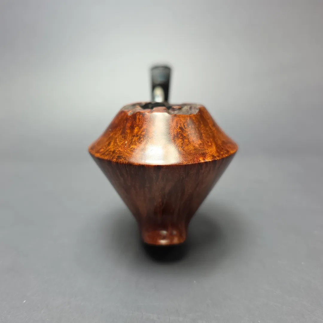 Though he is heavily influenced by Scandinavian-style pipe making, one group of shapes that Sebahattin Urgan is particularly fond of are bulldogs and Rhodesian. As he is so heavily influenced by Scandinavian-style pipe making, however, his renditions tend to be rather unconventional, especially compared to their classical counterparts. In the case of this one, it takes the basic Rhodesian form and weds it with a motif found in both the Danish and English freehand tradition, that of a pronounced, over-extended shank, lending the design an almost “footed” appearance. It could be compared to the “surfing” shapes of the Danes, for example, or the maritime “Keel” shapes of Charatan, for example, though in this instance it is quite different to either, while also serving as a sturdy base that allows the pipe sit quite comfortably on its own accord.