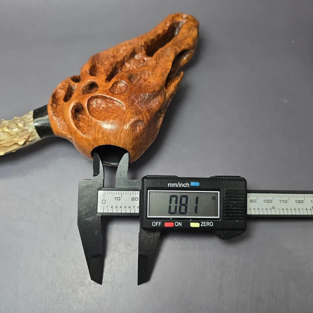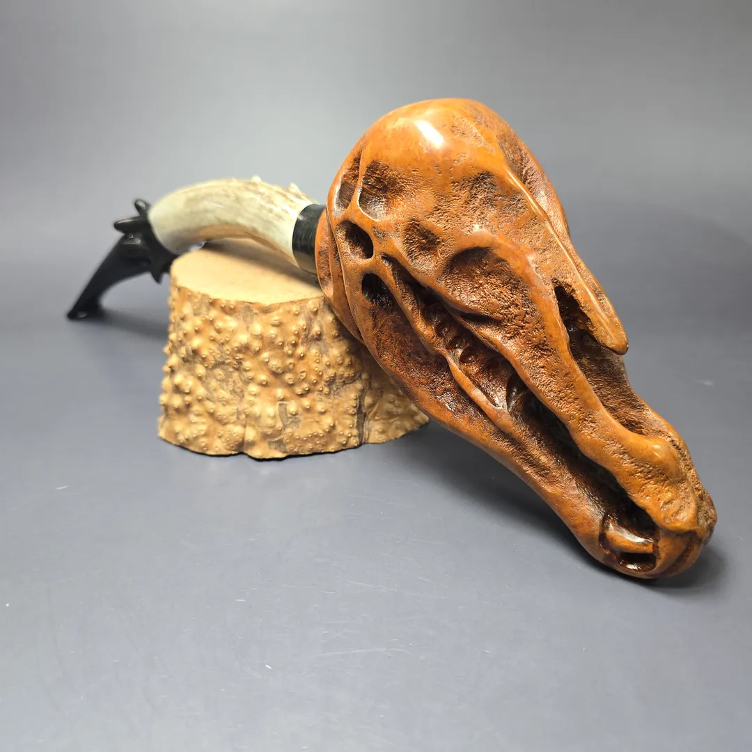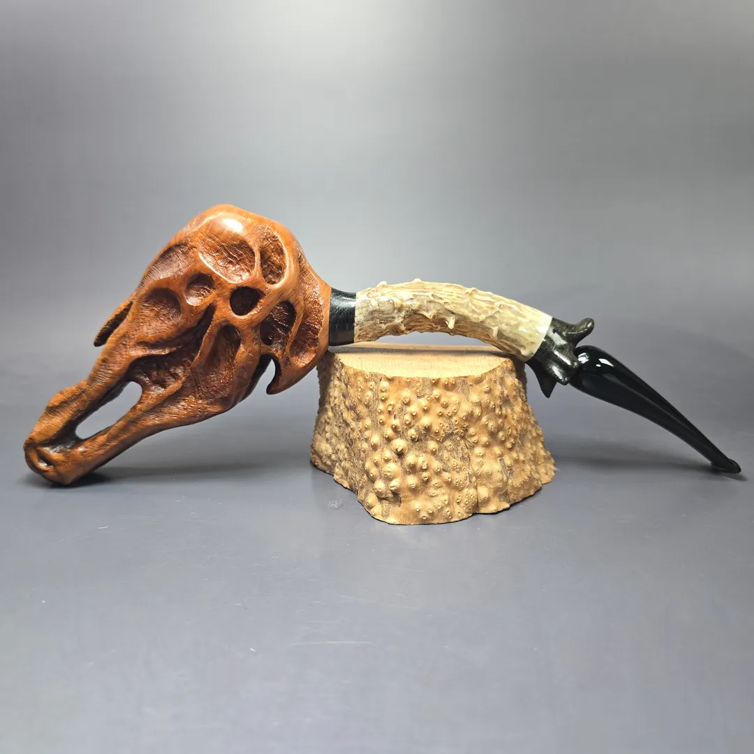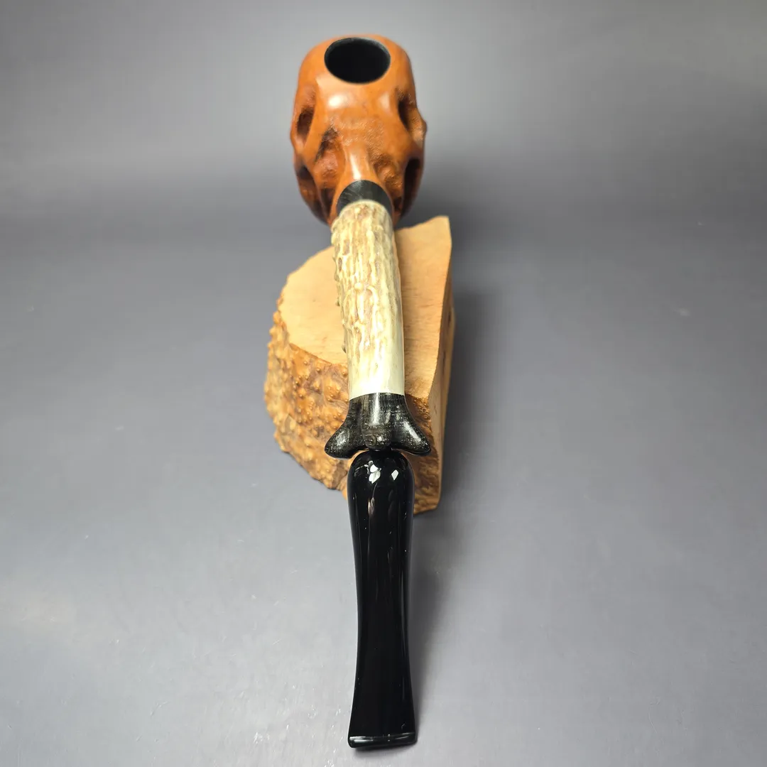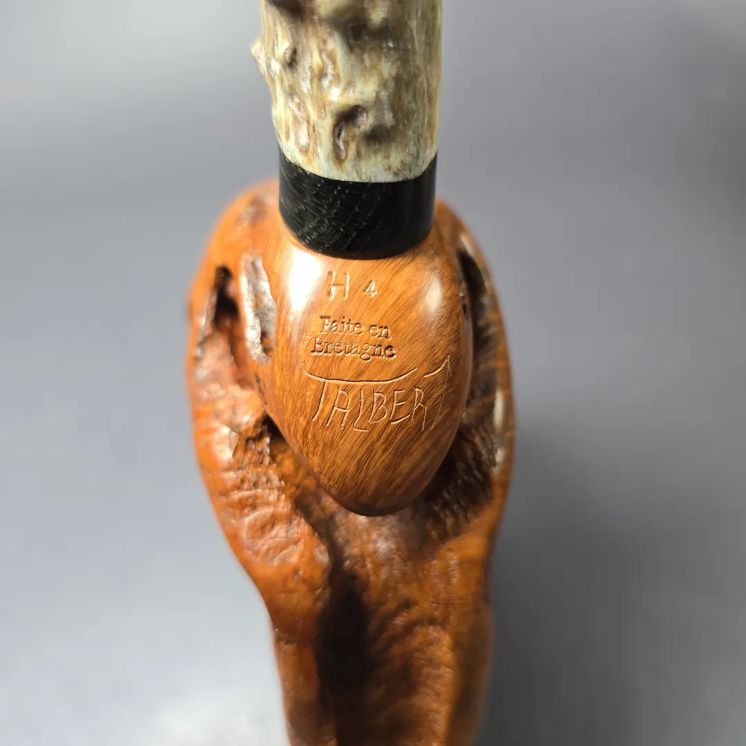 This one of the Halloween Pipes the Talberts made for 2004 (only four in total were made that year), and is perhaps one of the most grandiose designs even within that series. One could easily call it “Lovecraftian,” not only because it resembles a creature from one of the many films and television programs inspired by H.P. Lovecraft (John Carpenter’s The Thing, for example), but because its form is so complex and alien that it is difficult to put into words (a running theme in Lovecraft’s stories is that their protagonists are either unable to describe the horrors they’ve seen, or succumb to madness in trying to do so). Perhaps a basic itinerary of dimensions and composite materials will have to suffice: large, long, heavy; briar, morta (bog oak), antler, more morta, ebonite.