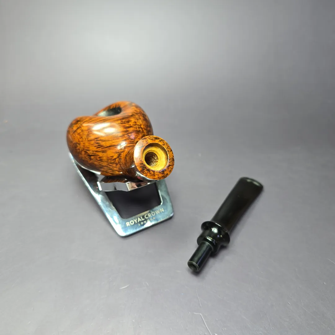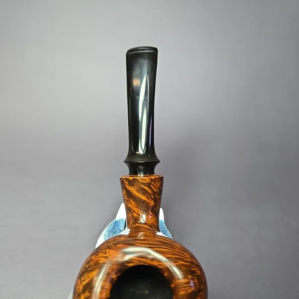For decades now, one of the defining attributes associated with Japanese pipes has been asymmetry. In contrast to the geometric forms that dominated traditional pipe making—especially briar pipes—and even much of the early decades of modern, post-war pipe making, Japanese pipes have been notable for their eschewal of easily recognizable shapes or figures. An old friend of mine spoke of such pipes as expressions of Wabi-sabi, a kind of wide-ranging philosophical doctrine that has been part of Japanese culture for centuries. The aesthetic ideals of Wabi-sabi are rather different to those of typical of Western cultures, and as such the notion of beauty in the former seem like something of an inversion of the latter. The Japanese approach, as seen quite distinctly in this Tsuge Ikebana, finds beauty in imperfection and evanescence, which stands at odds with a preferences for orderliness and timelessness that is traceable to Western antiquity. On the other hand, it is not enough to simply appear “misshapen” to be beautiful; not unlike more modern Western art, it is a matter of letting just the right amount of chaos into a work. In this instance, the squat, slightly skewed angles of the bowl are softened by a mirroring of bird’s-eye patterns at its flanks, with cross-grain joining the two at its front and rear. Similarly, the wave-like concave curvature of the rim runs parallel to the base of the bowl. The result is something that captures and captivates the imagination, rather than confuse it. And, of course, is sure to smoke well, too.