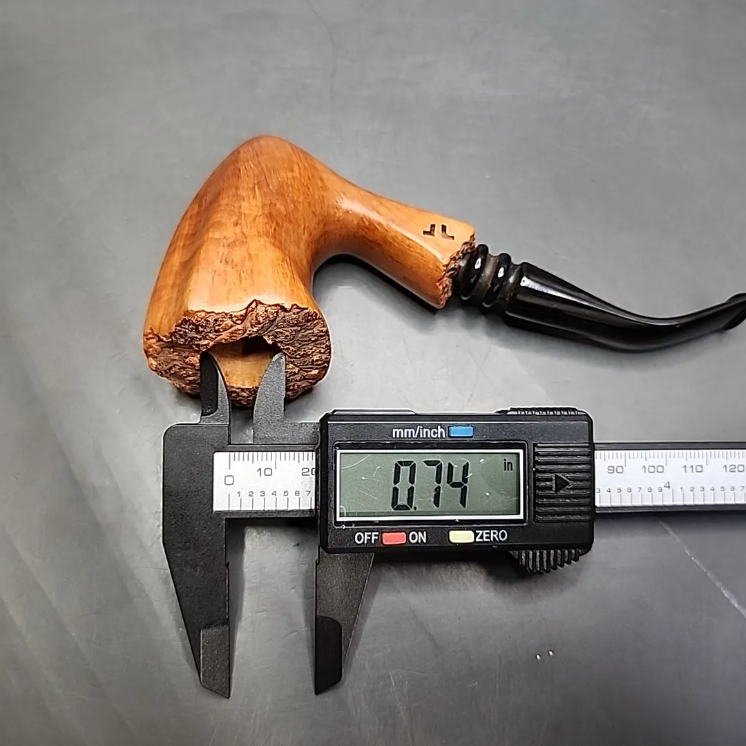 This pipe was a mystery for me. A big mystery, actually. It’s a freehand – a large one at that – but I have not been able to find out who made it. Normally, when I can’t find out who made a pipe, I look up the trusty resources provided by Pipephil and Pipedia, but I couldn’t find anything there that seemed conclusive. I also asked colleagues, friends who are pipe historians and collectors, and pipe forums to see if I could identify the maker, but they didn’t know either. The only stamping on the pipe takes the form of two marks that look like a lowercase “r” or “t” that are mirrored, as you can see in the pictures. I’m inclined to think it’s from an American carver, based on the style, but it could be from anywhere, really. It’s well made, with plenty of bird’s-eye, a natural finish that shows off these grain patterns, and a beaded stem that looks to be hand cut. If anyone reading this knows who made it and can provide something by way of proof, I’m happy to give an MBSD voucher in return.
