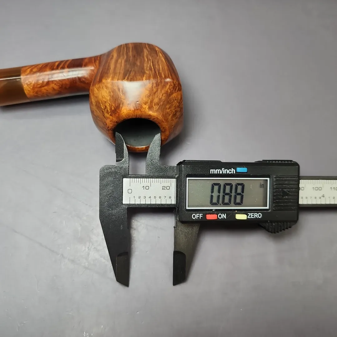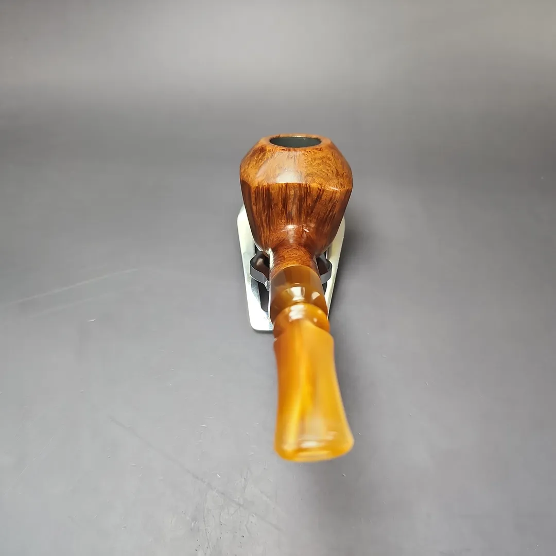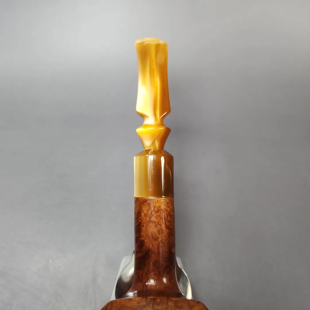 This pipe came in with a large lot of Edward’s pipes, a significant pipe company in the United States in the 20th century and which Randy Wiley once worked for. It is very similar in style, which led me to think it could be related to Edward’s in some way, though as it is not stamped (or the stampings have buffed off), I can’t say anything conclusively about its maker. On the other hand, I can say that it’s a nice pipe, taking the form of a large, freehand panel-Rhodesian hybrid, with excellent straight grain and a golden acrylic army mount and stem.
