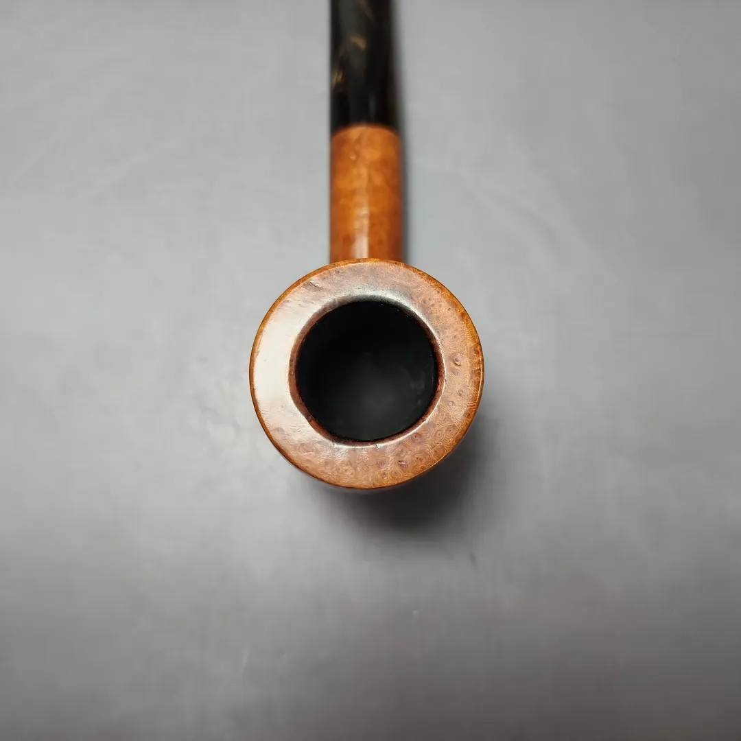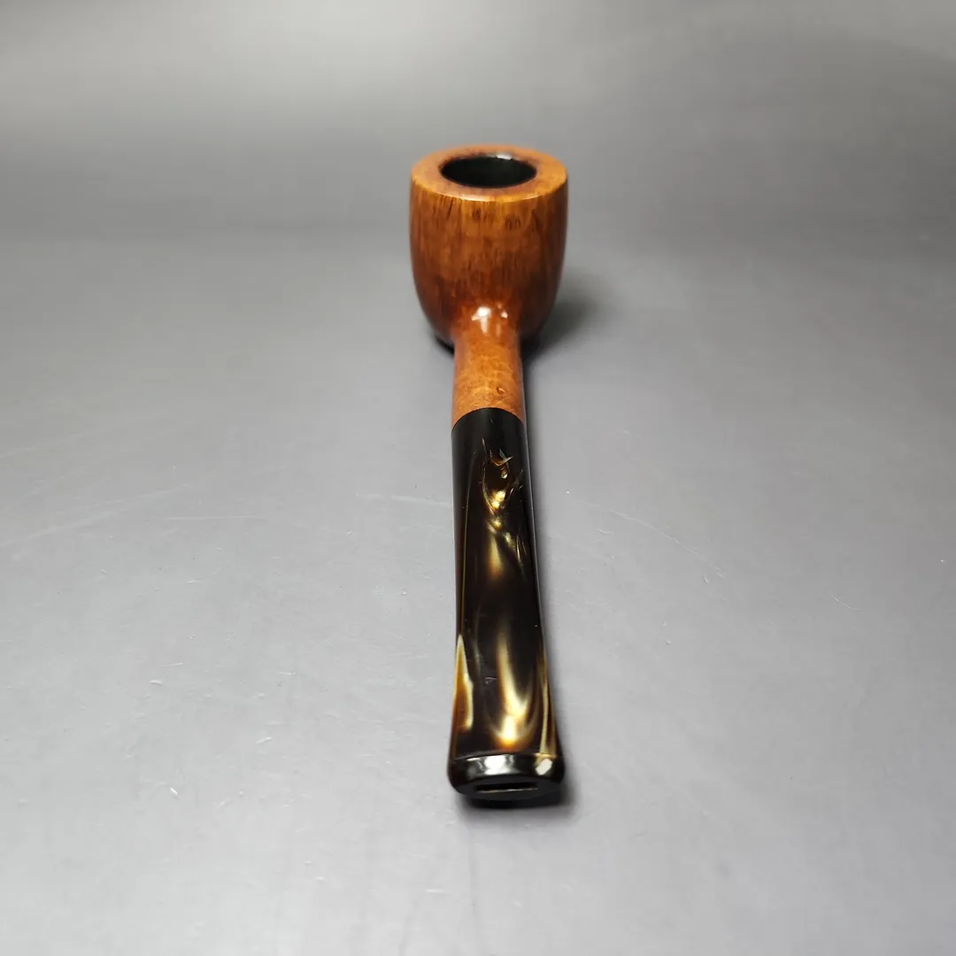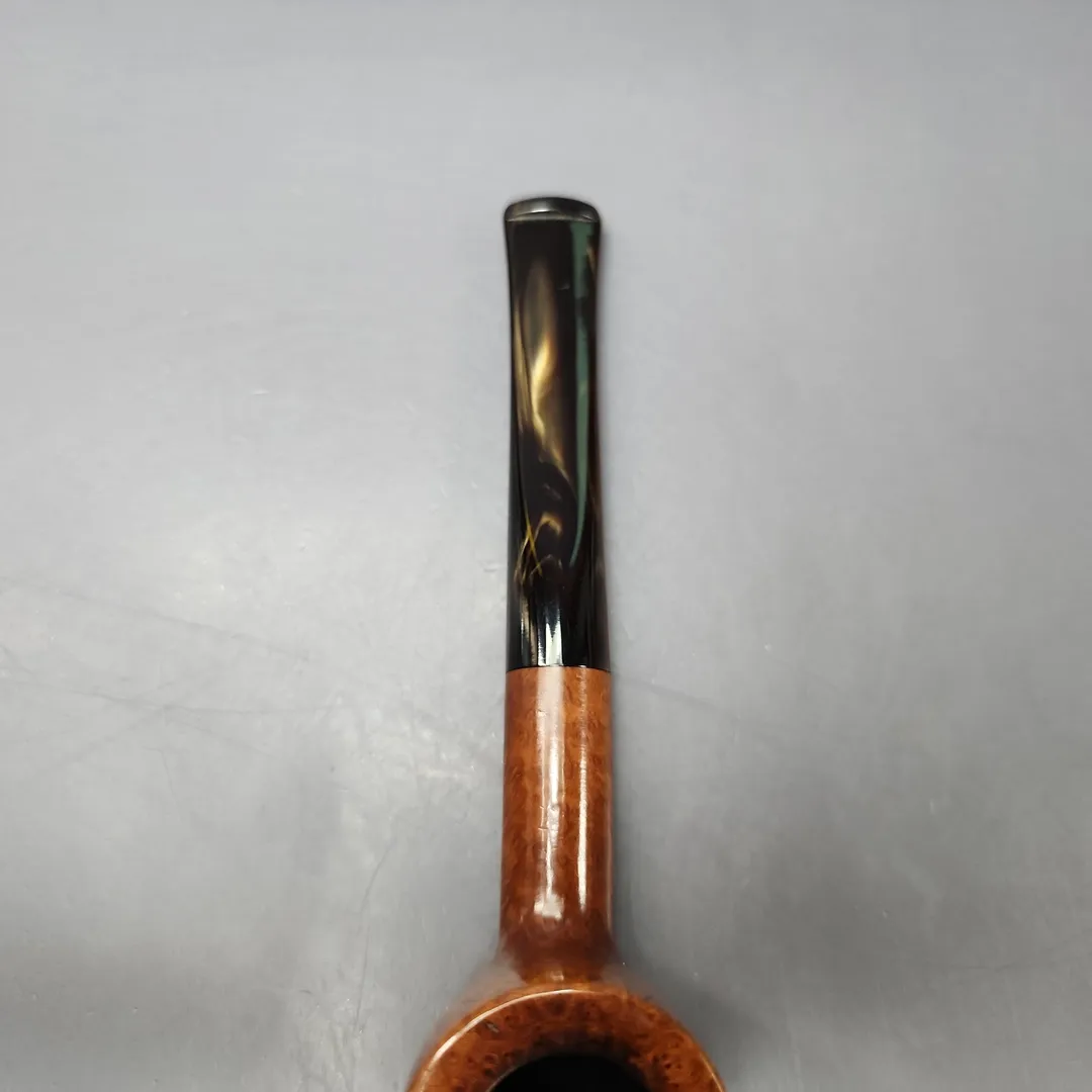This is another mystery pipe that came in with a large lot of Edward’s pipes, the latter being a significant pipe company in the United States in the 20th century and which Randy Wiley once worked for. As with the other pipe, I do wonder whether it could be related to Edward’s in some way, though as it is not stamped (or the stampings have buffed off), I can’t say anything conclusively about its maker, either. The design is one of a clearly handmade pot sitter, with good, straight grain and a swirling golden acrylic stem.