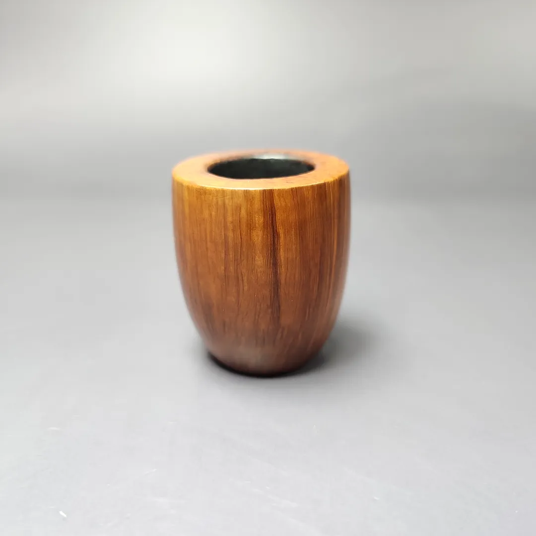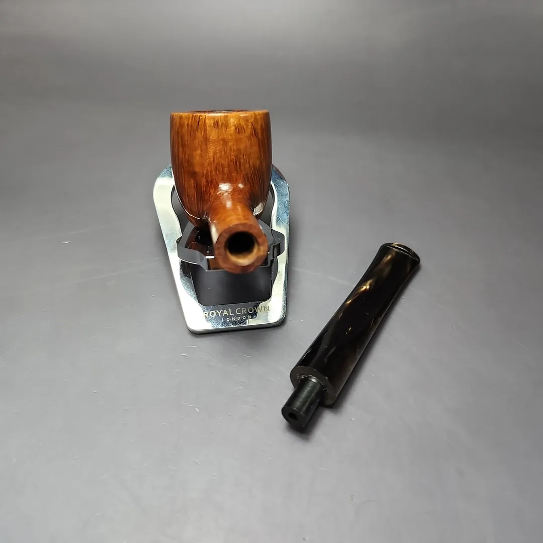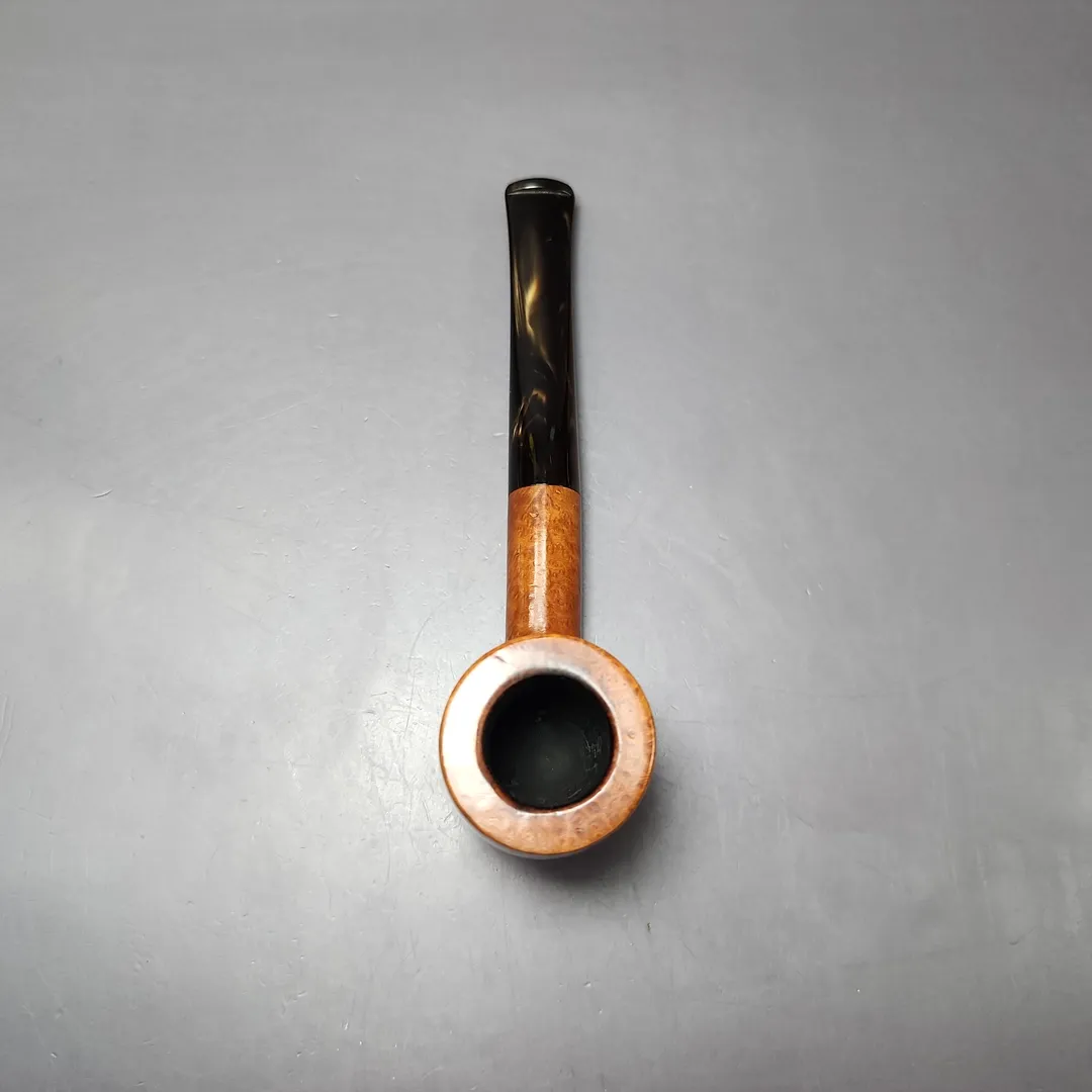 This is another mystery pipe that came in with a large lot of Edward’s pipes, the latter being a significant pipe company in the United States in the 20th century and which Randy Wiley once worked for. As with the other pipe, I do wonder whether it could be related to Edward’s in some way, though as it is not stamped (or the stampings have buffed off), I can’t say anything conclusively about its maker, either. The design is one of a clearly handmade pot sitter, with good, straight grain and a swirling golden acrylic stem.
