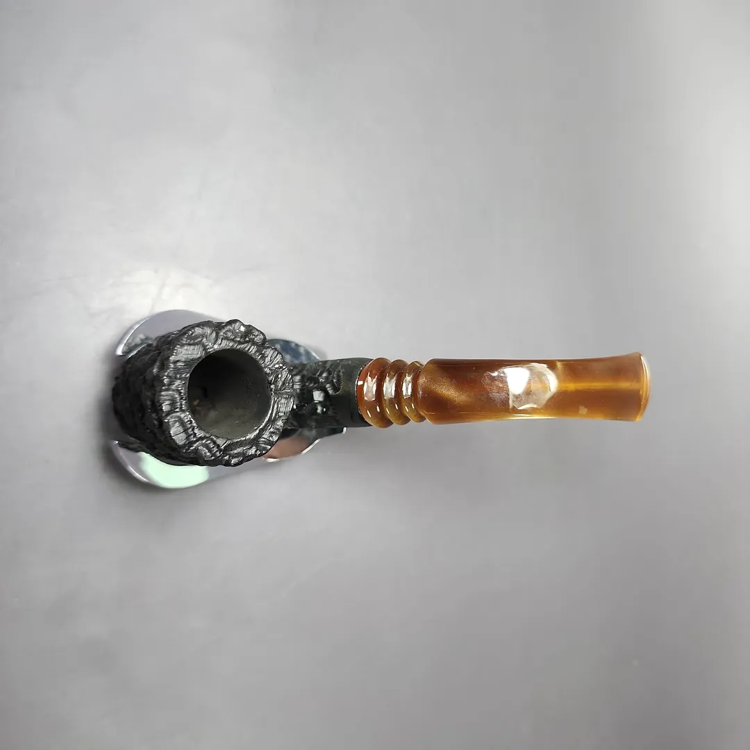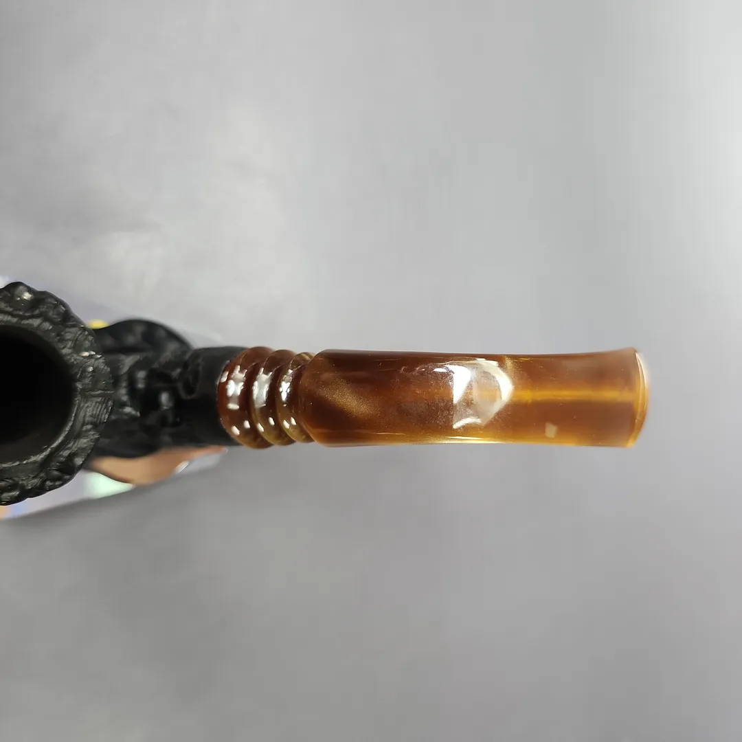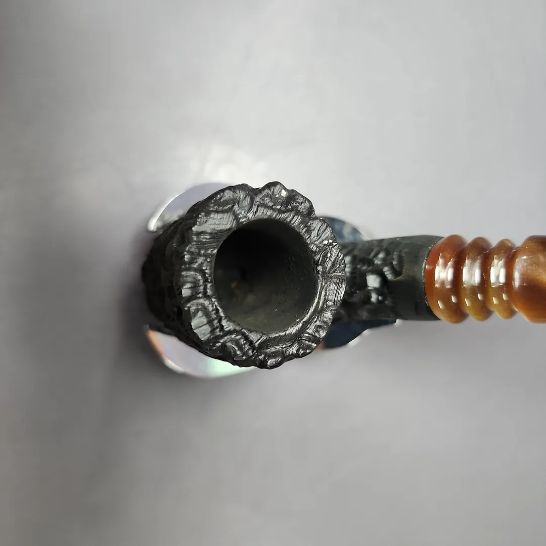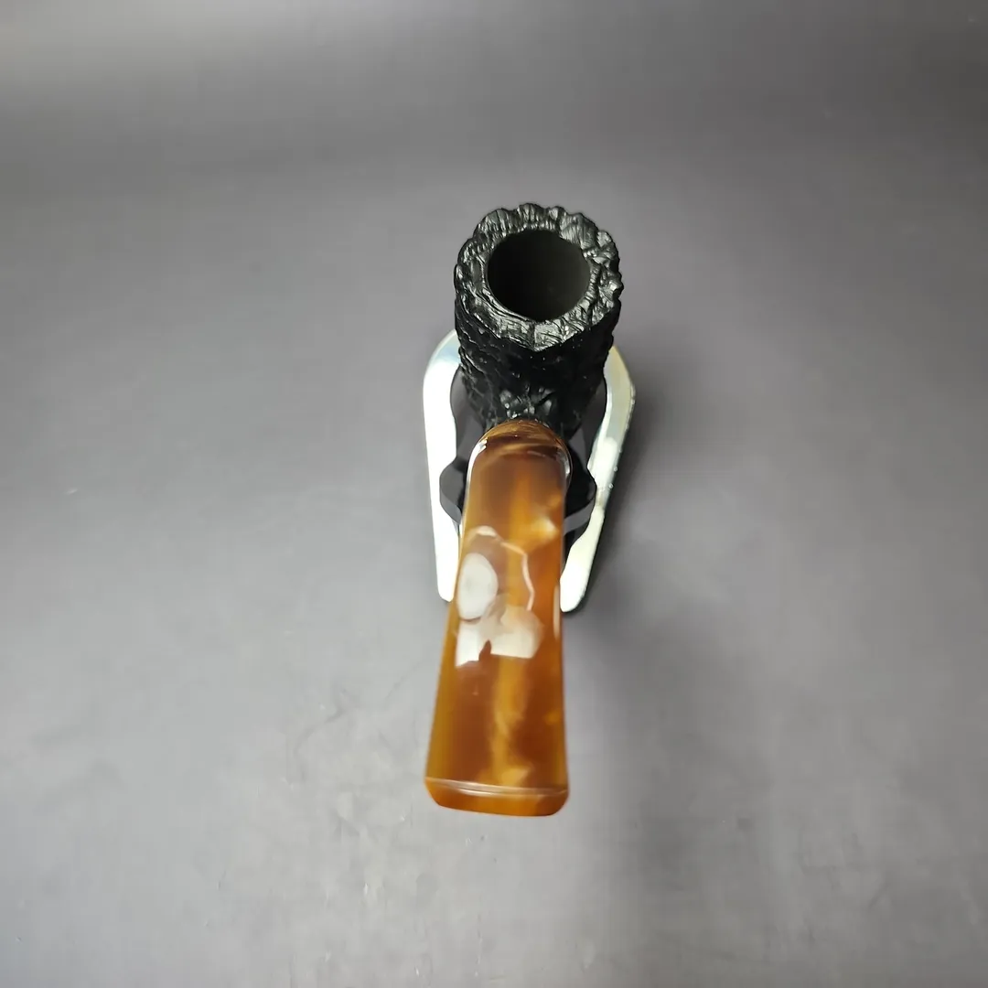 I don’t know the maker of this particular pipe, unfortunately. It’s a nice one, though. The aesthetic is very much reminiscent of some of the pipes made for Jobey (the Stromboli in particular), including the colorful Lucite stem and screw tenon. The meerschaum itself looks to be African, making it an older piece, for certain.