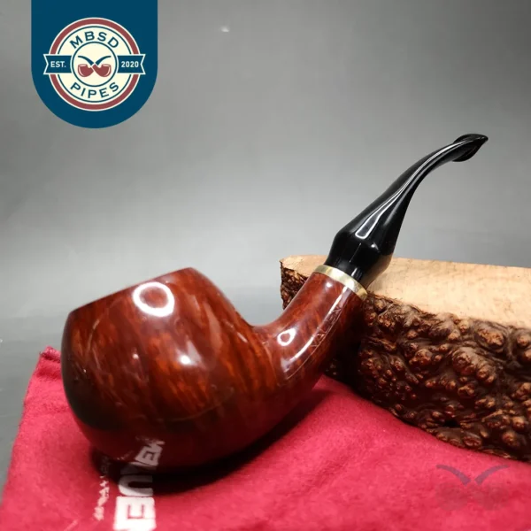 We’ve received a few NOS (new old stock) Vauen pipes recently. It’s been a great time capsule into the Vauen pipes of old. One thing I’ve noticed, is that the older Vauen series – like this one – focused less on bold and ostentatious finishes, and more on simpler, classical designs. This Vauen is a traditional bent apple, dressed in a light, red-brown stain that allows its beautiful flame grain to really shine through. This one also has an original P-lip style stem, rather than a standard fishtail. This was more common a practice in the 20th century than it is today, one that other makes, such as Hilson and Savinelli also explored.