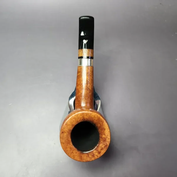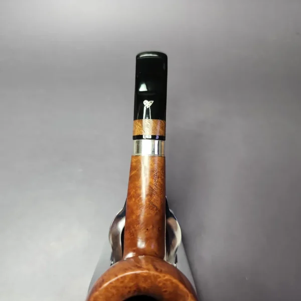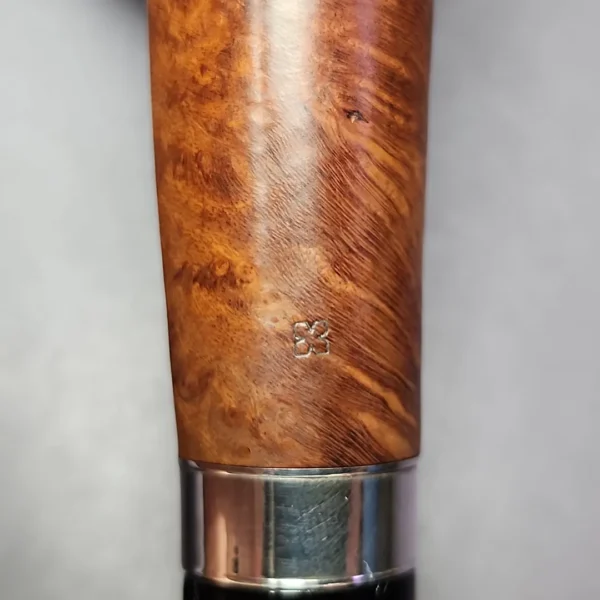 One thing I’ve learned from handling Viprati estates over the years is that he doesn’t do things by halves. This particular pipe is a good example of that. Viprati grades most of his smooth pipes using four leaf clovers, or quadrifogli, with one clover being the first rung on the ladder. But even then, as seen on this one clover grade acorn, the pipes are hand-shaped to bring out great grain patterns, and are usually adorned with some form of ornamentation, such as the sterling silver collar and briar stem inlay seen here.