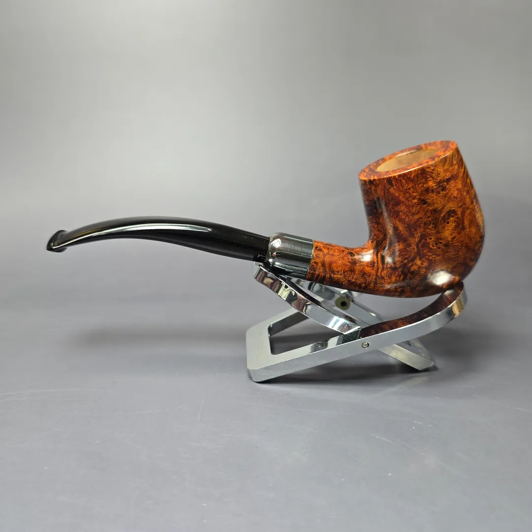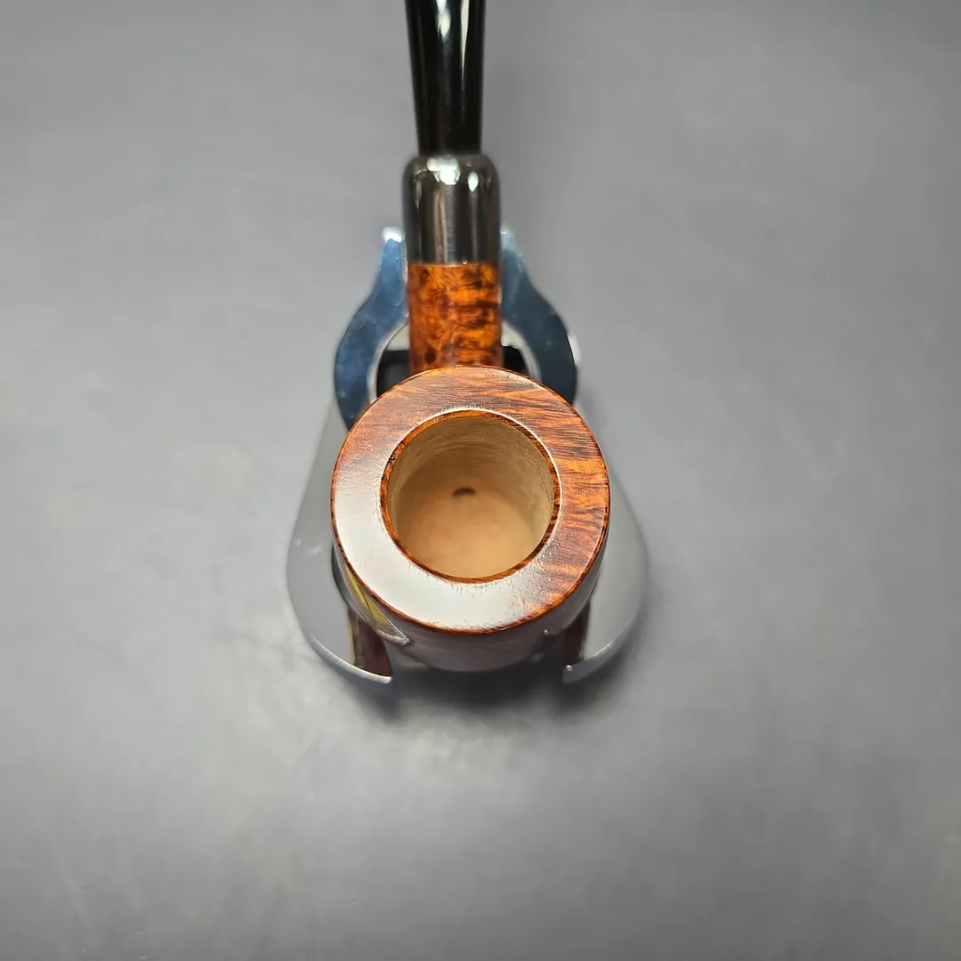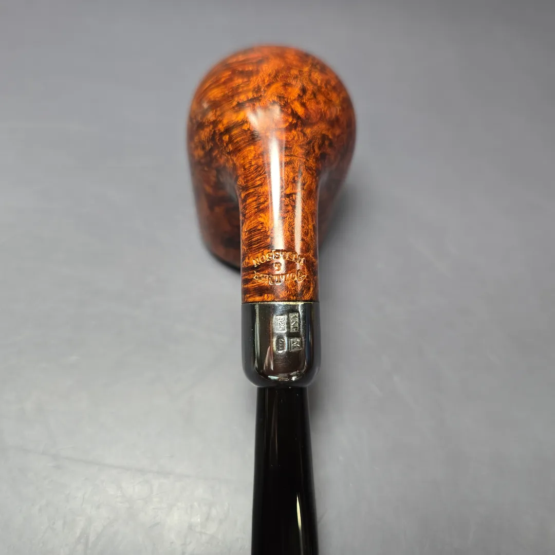 While Martin Vollmer and Anders Nilsson are certainly versatile when it comes to pipe making, and are able to produce remarkably beautiful “Danish” or “Scandinavian” shapes, the quality and demand exhibited by their more classical renditions persists at a level perhaps not seen since the golden age of English pipe manufacturing. This bent billiard is yet another example of two Swedish gentlemen making the pipe that so many British, French, and American companies worked tirelessly to create for around 150 years. A simple bent billiard, with a sterling silver army mount of the half-brothers’ own making, the pipe is at its heart a throwback to the designs of the late 1800s and early 1900s, right down to its basic proportions. One might even call it a love letter to those pipes. Yet it arguably does what those pipes, at least the majority of them, couldn’t, not least because of its perfect, bird’s-eye briar and its finish, which shines even brighter than its precious metal adornment.
