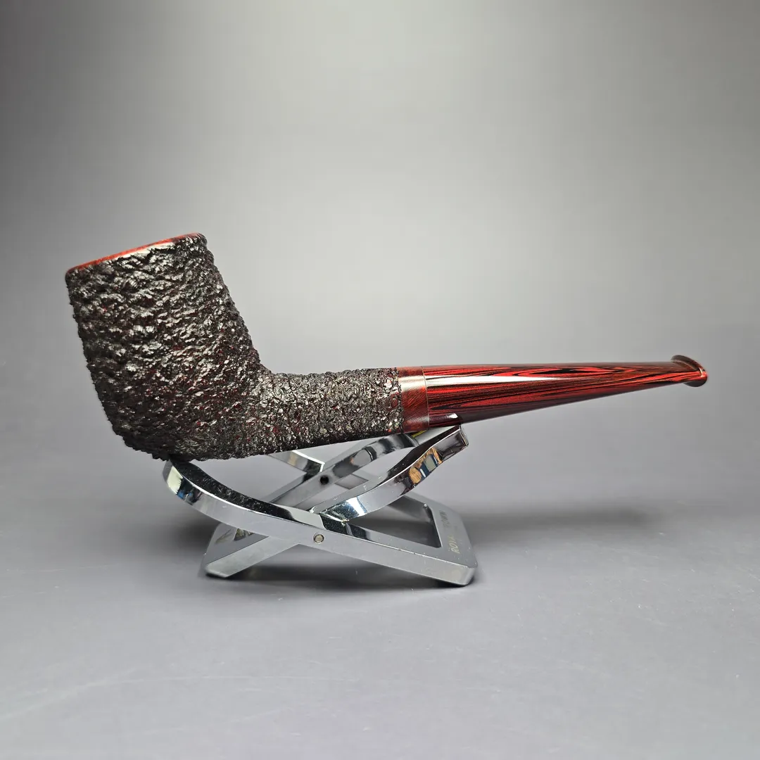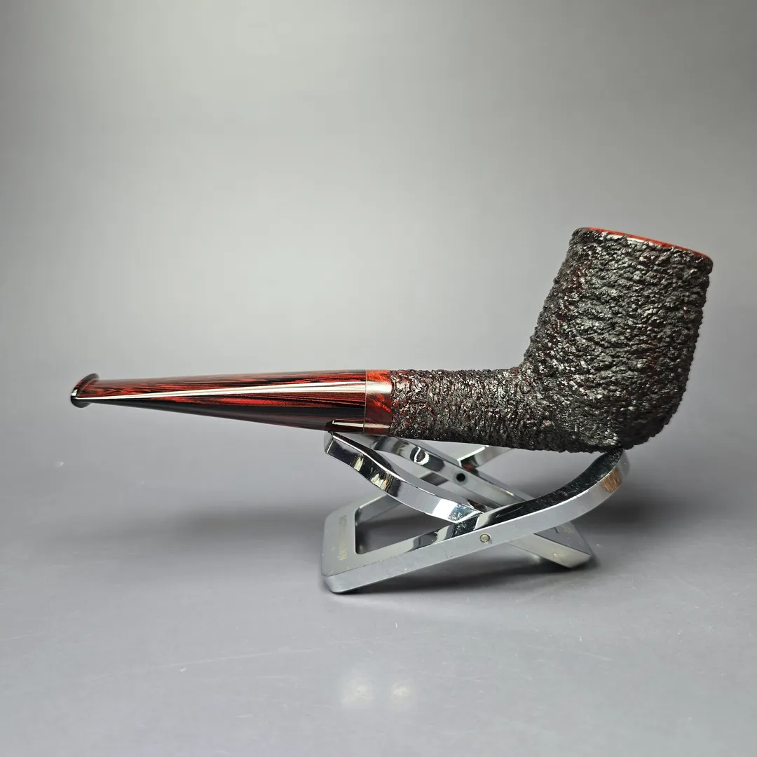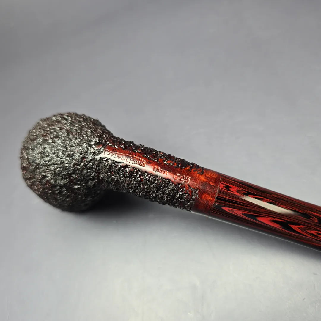This stout billiard, for example, is part of Cannoy’s Cardinal House Munn subseries, named after Lake Munn in Lakeland, Florida. As with another Cardinal House listed alongside this one, it leans decisively toward the classics as far as shaping goes, including incorporating the distinct forward cant of early billiards. The finishing and stem are a little more modern, incorporating a pebble-dash partial rustication in the American tradition and a hand-cut NYH cumberland stem respectively. This Munn also belongs to the 10th Anniversary run of Cardinal House pipes and includes a special, commemorative sleeve.