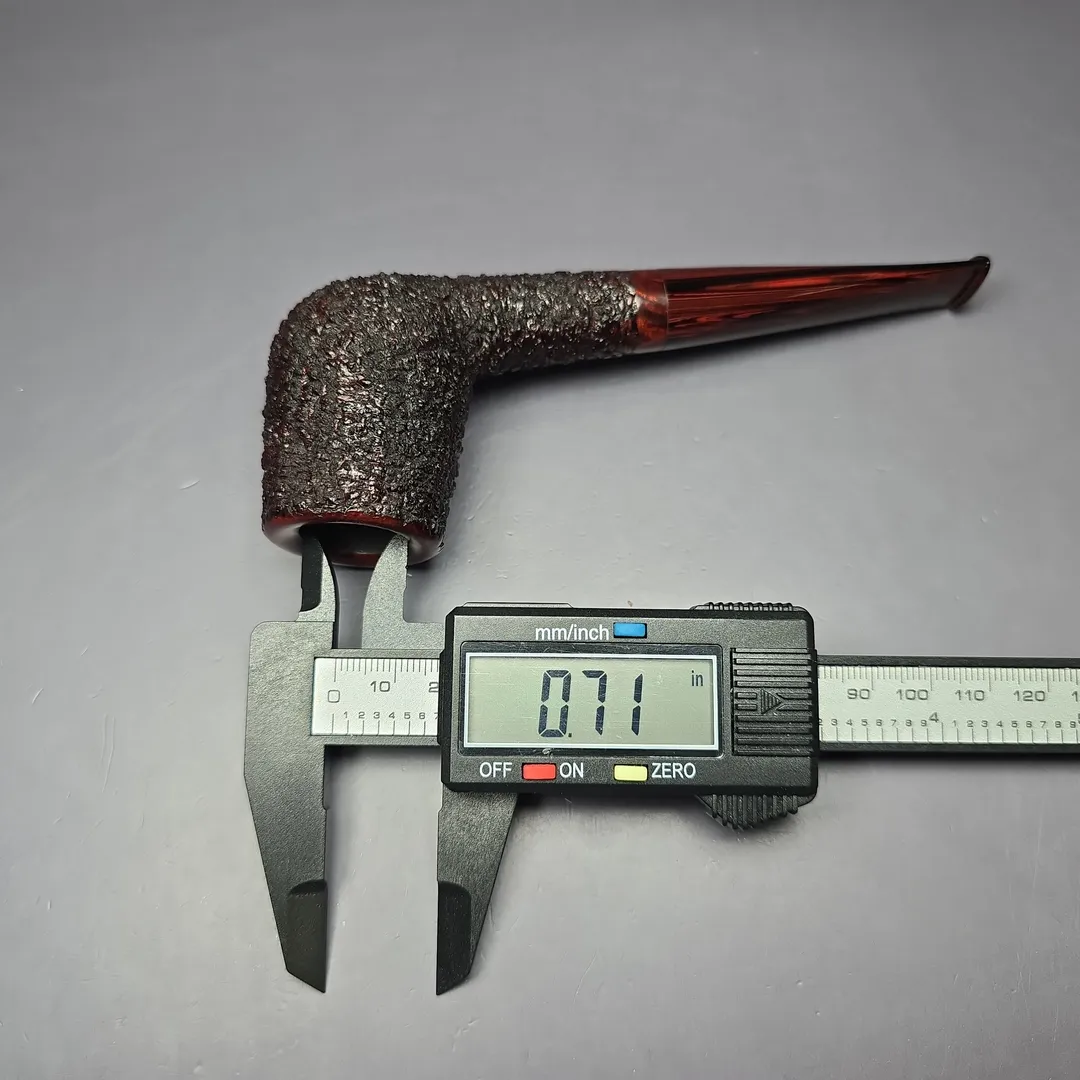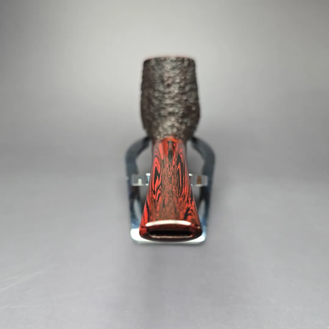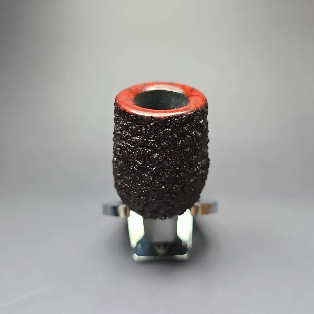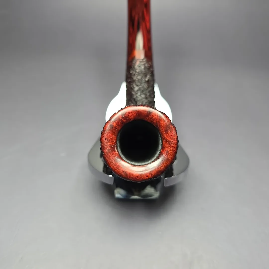 This stout billiard, for example, is part of Cannoy’s Cardinal House Munn subseries, named after Lake Munn in Lakeland, Florida. As with another Cardinal House listed alongside this one, it leans decisively toward the classics as far as shaping goes, including incorporating the distinct forward cant of early billiards. The finishing and stem are a little more modern, incorporating a pebble-dash partial rustication in the American tradition and a hand-cut NYH cumberland stem respectively. This Munn also belongs to the 10th Anniversary run of Cardinal House pipes and includes a special, commemorative sleeve.