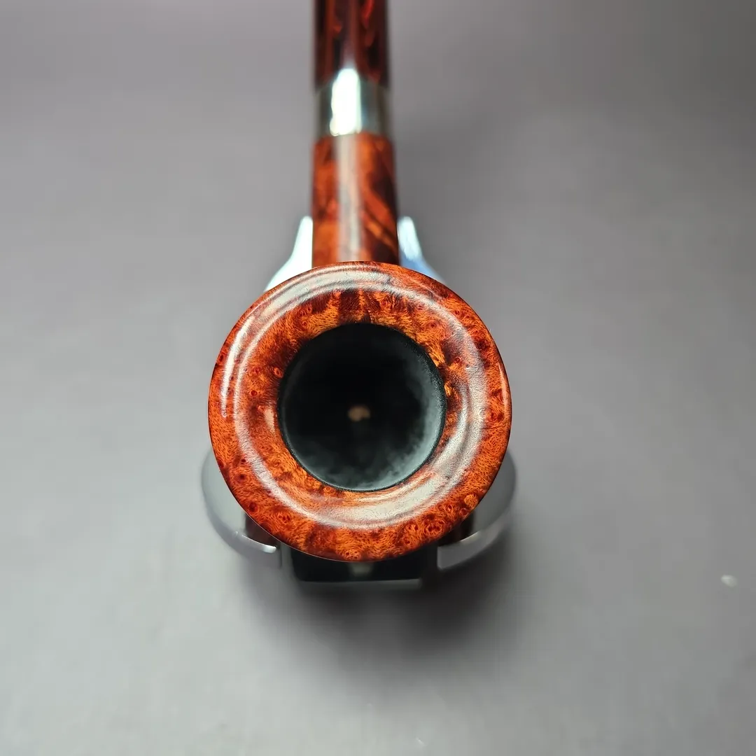 “Cardinal House” began as a side-project of Florida’s Walt Cannoy, before evolving into more of a division of separate lines within his output. The Cardinal House “Munn” and “Morton” lines, for example, wear rusticated finishes; “Hollingsworth” and “Langford,” on the other hand, are smooth pieces. This Hollingsworth, named for Florida’s Lake Hollingsworth, is an eminently classical pot, from its sterling silver collar to its slight forward cant. Something I have noticed about Cannoy’s pipes over the years is his impeccable eye for color composition, and this one is no exception.