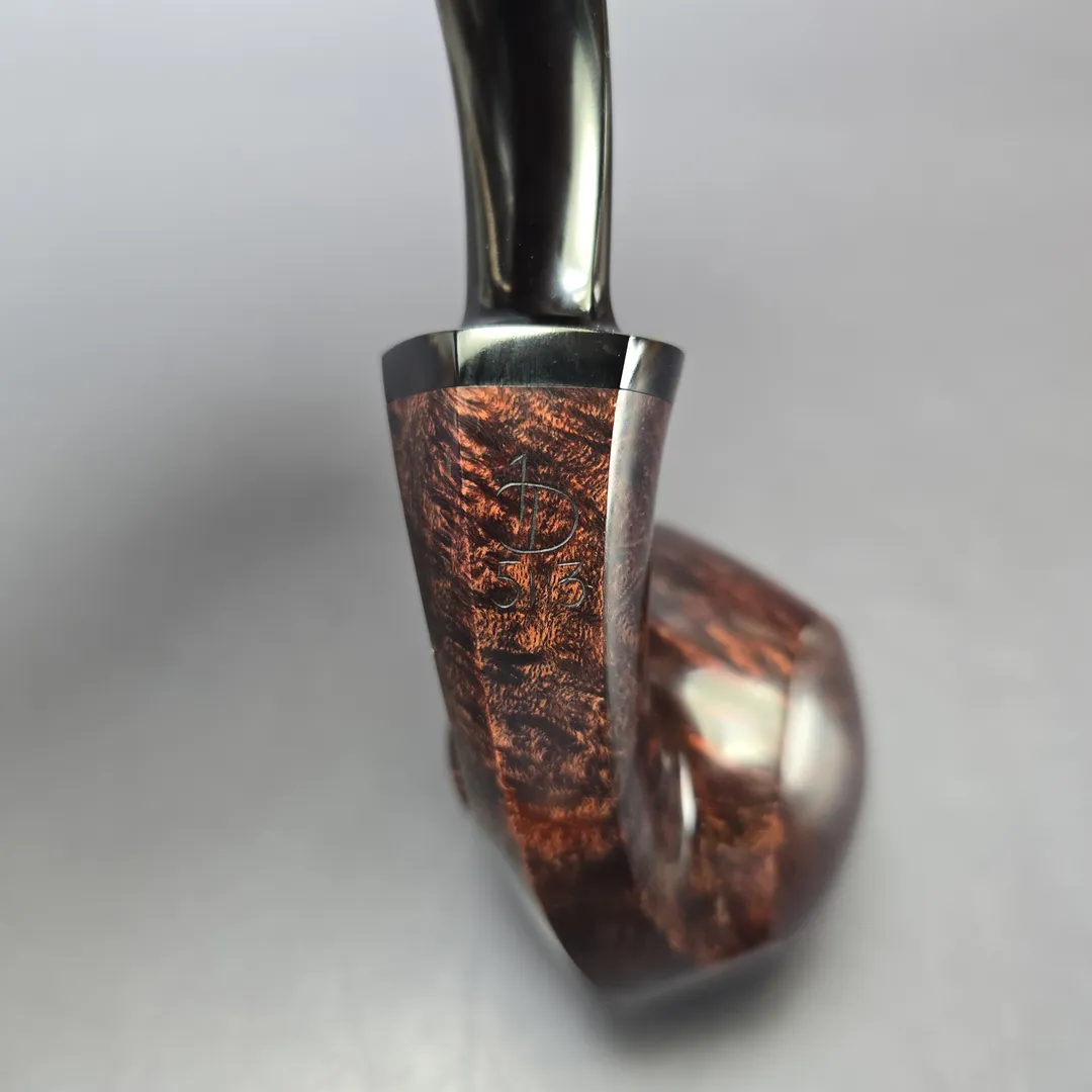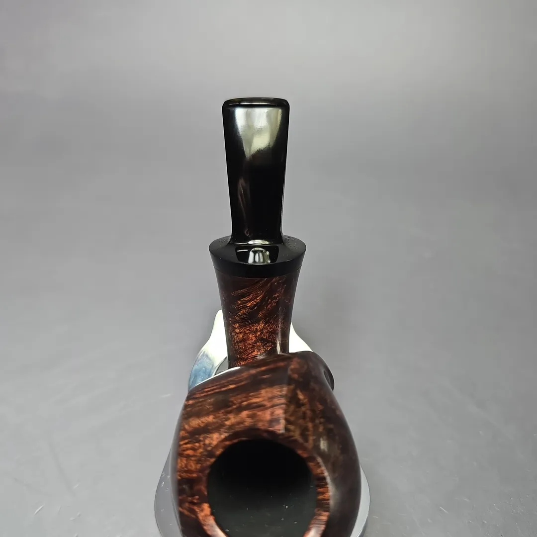 While the blowfish began life as a rather plump design, adequately reflecting its inflated, aquatic namesake, its scope would broaden significantly over the years to encompass a vast range of forms. I suppose that’s also quite fitting—that the term “blowfish” would balloon so significantly—but it is interesting nonetheless. While the original Lars Ivarsson blowfish was stout and slightly squat, other renditions soon followed that were tall and distinctly narrow, such as the disc-like blowfishes of Peter Heeschen. Japanese artisans, like Hiroyuki Tokutomi, could be said to have followed a “middle ground” between the Ivarsson style and the Heeschen, though not without injecting a characteristic asymmetry that broke, once again, with conventions of form. In the case of this pipe, we see Wandi Riyadi tackle yet another blowfish breakaway, this time in the vein of someone like the American David Huber. Like Huber’s renditions, it’s decidedly compact, taking on nosewarmer proportions while simultaneously being wildly complex, incorporating broad, flattened planes, furls and furrows, a mobile, “twisting” physique, and a rim that opens like a mouth for prey (the blowfish is a carnivore, after all). One wonders if the blowfish has ever quite been so “alive” as this particular species—it’s certainly never been as ravenous.