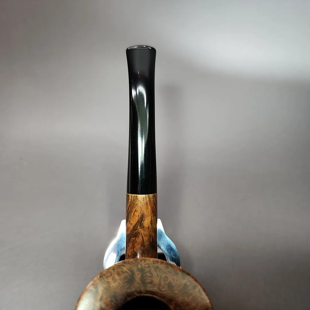 The “Straight Grain” models were WO Larsen’s finest pipes, being handmade, from beginning to end, by only the most skilled craftsmen in the workshop. For “Select” grade pipes, this would be a team effort, with turning bowls, cutting stems, and finishing being handled separately. Only the Straight Grain pipes would be made by a sole carver, typically by Sven Knudsen, Former, Tonni Nielsen, Teddy Knudsen, or Benni Jorgensen, depending on the current staff roster. This particular Straight Grain, a grade “3,” is a beautiful, distinctly Danish Dublin, with a flaring, almost trumpet-like, bowl and a long, slender shank and stem. The bowl looks to have furthermore been contrast stained to accentuate the grain patterns of the briar.