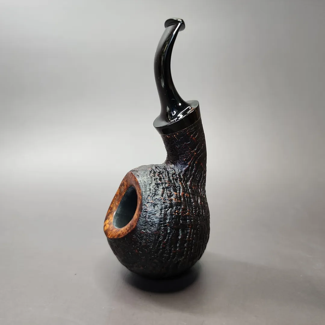 As I mentioned in other recent listings, since his debut at MBSD Pipes, I’ve had a chance to speak more with Xin Li about his creative process. One thing that became very evident was a striving for balance in his compositions. That was certainly the case for the others in this most recent batch, but this one might just have outdone them. Many pipes, for example, we expect to be “sitters,” i.e., to stand up unaided. Pokers and cherrywoods are the most obvious shapes to come to mind, and it’s always a little bit disappointing when a rendition of one of these shapes isn’t a sitter. With Xin’s pipes, I find that even the most modern of shapes, such as this strawberry, possess a surprising and almost balletic quality in their ability to remain upright and level—albeit in a delightfully unorthodox way. Then again, it is less surprising when taking into account the sense of proportionality and coherence that Xin is able to bring to his overall designs, this one included.